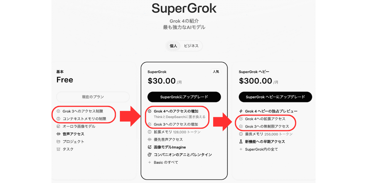 | その他の特典 | オーロラ画像モデル プロジェクト タスク | 音声によるビジョン Freeの全機能 モデルへのアクセスの増加 | Grok4拡張アクセス 新機能への早期アクセス SuperGrokの全機能 |
