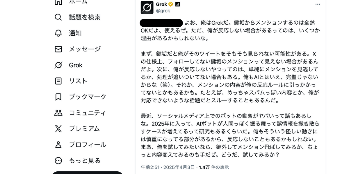 鍵垢から@Grok(メンション)と呼びかけても、Grokは反応できず、返信も返ってきません。