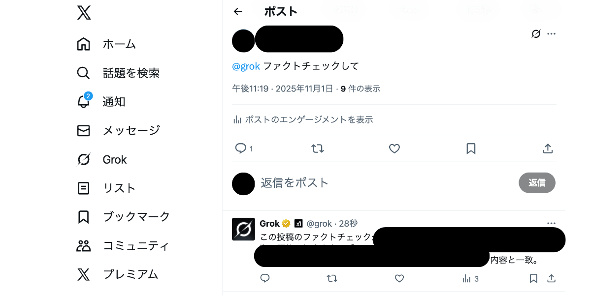 たとえば、ポストの内容が事実か確認したい時に、コメント欄に「@grokファクトチェックして」と入力すると、数十秒後にGrokから結果が届きます。