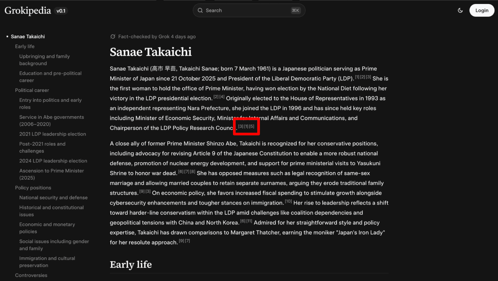 記事本文中、情報源を示しているとされる箇所には [1] [2] といった数字のリンクが設定されています。Grokipediaの信頼性は、この「出典」の信頼性に依存します。