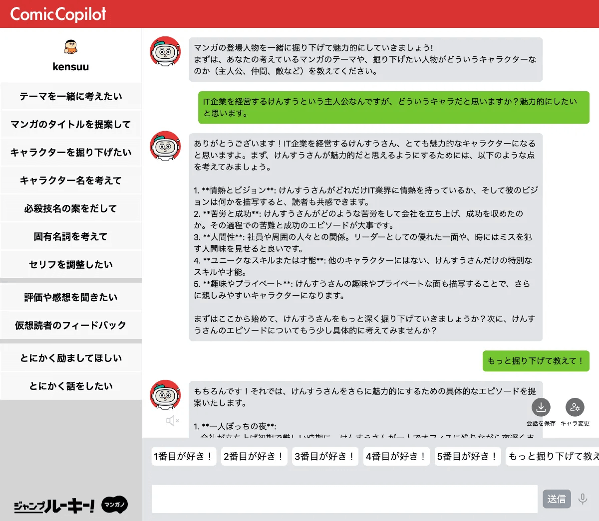 AIに質問形式で漫画のアイデア出しを依頼することができる直感的なインターフェースを持ち、ジャンルや設定を指定するだけでストーリーの提案を受けられるといった使いやすさが特徴です。