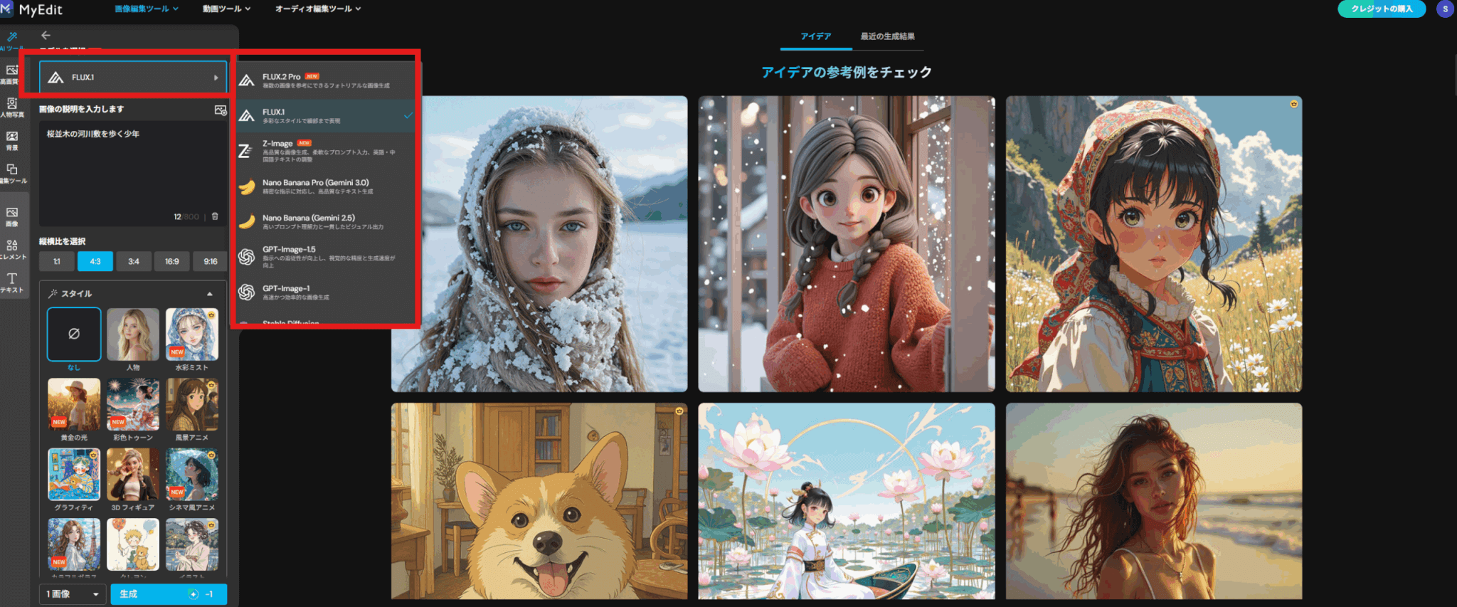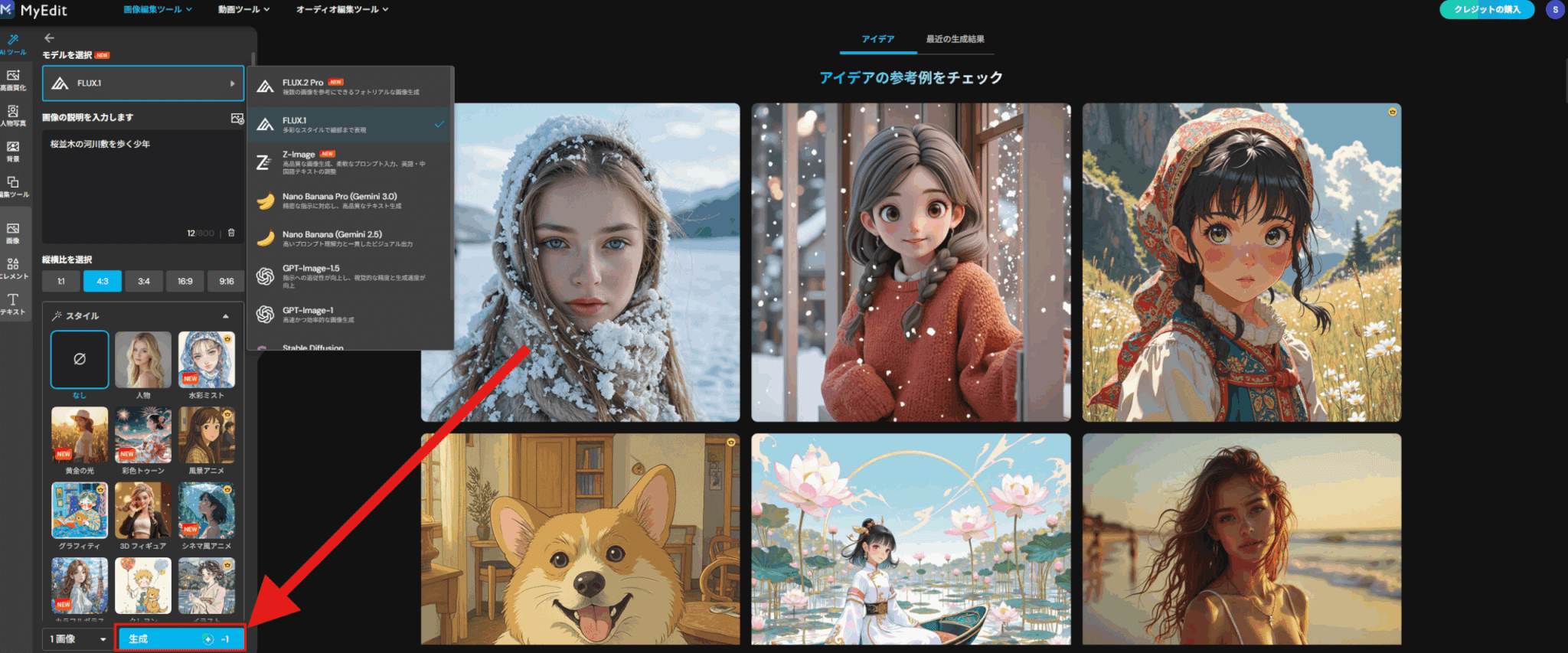 MyEditの画像生成機能の強みは、Nano Banana ProやFluxなど複数の最新AIモデルを目的に応じて使い分けられる点です。