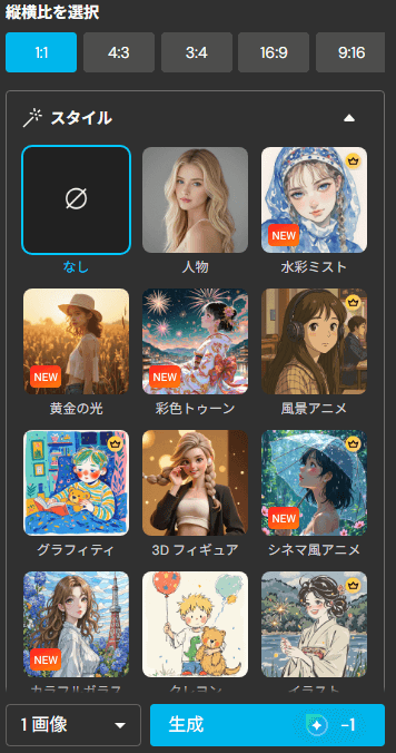 さらに、「縦横比」や「スタイル」を選択し、「生成」をクリックします。