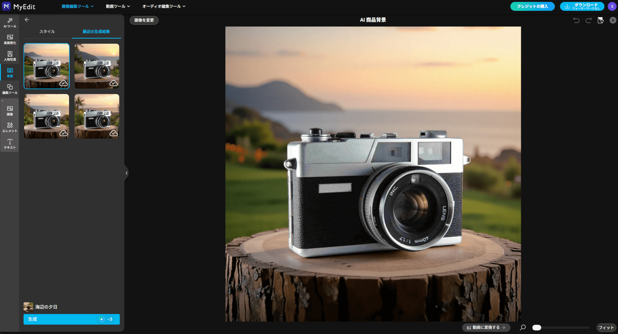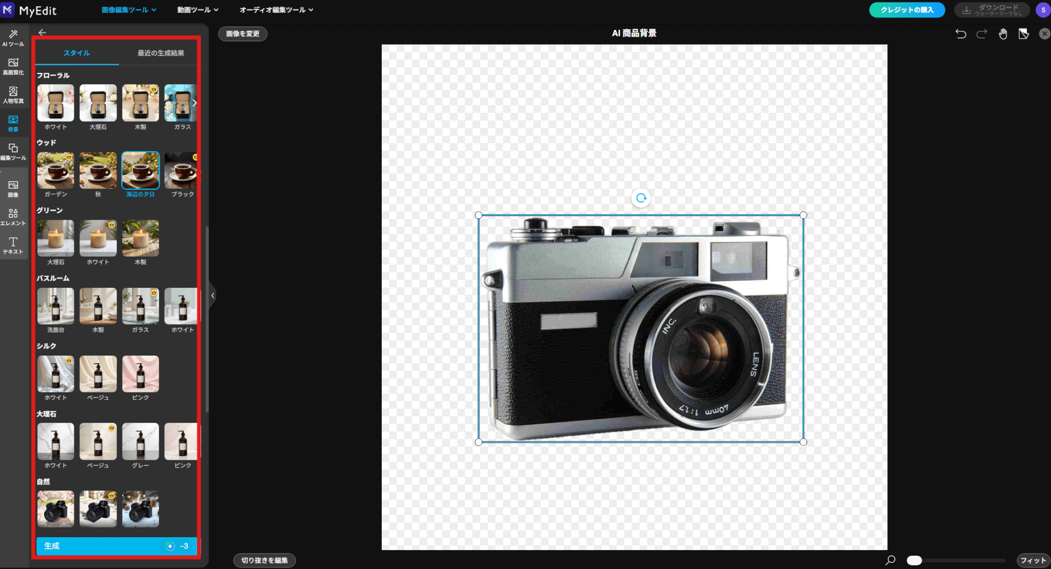 対象画像のアップロード後、左側にある「スタイル」から背景のスタイルを選択し、「生成」をクリックします。今回は「海辺の夕日」を選択しました。