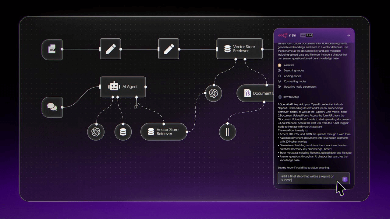 訳)n8nフォームを通じてPDF、CSV、またはJSONファイルを受け付けるパイプラインを構築する。文書を1000トークン単位に分割し、埋め込み生成を行い、ベクトルデータベースに保存する。ファイル名をドキュメントキーとして使用し、アップロード日時やファイルタイプなどのメタデータを追加する。ナレッジベースに基づく質問に回答できるチャットボットを組み込む。