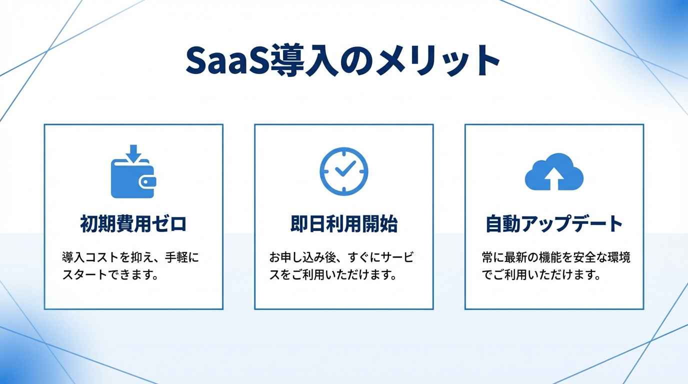 16:9の横長画像。中央に大きく「SaaS導入のメリット」というタイトル。その下に3つのアイコンと見出しを横並びで配置。 左「初期費用ゼロ」財布のアイコン、中央「即日利用開始」時計のアイコン、右「自動アップデート」クラウドのアイコン。各アイコンの下に1行の説明文。青と白のシンプルなデザイン。