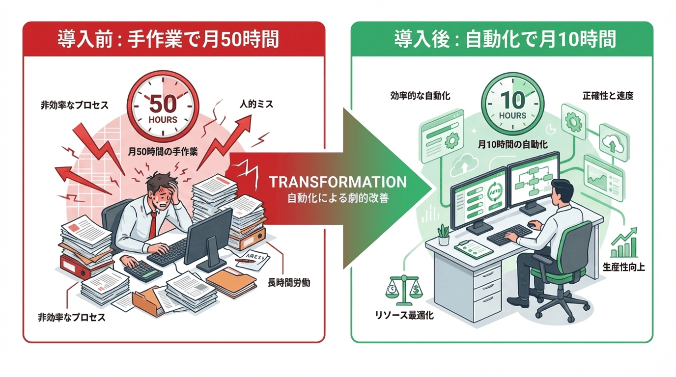16:9の横長画像。導入前と導入後の比較図。左側に「導入前:手作業で月50時間」、 右側に「導入後:自動化で月10時間」のテキスト。 真ん中に大きな矢印。色は赤から緑へのグラデーション。