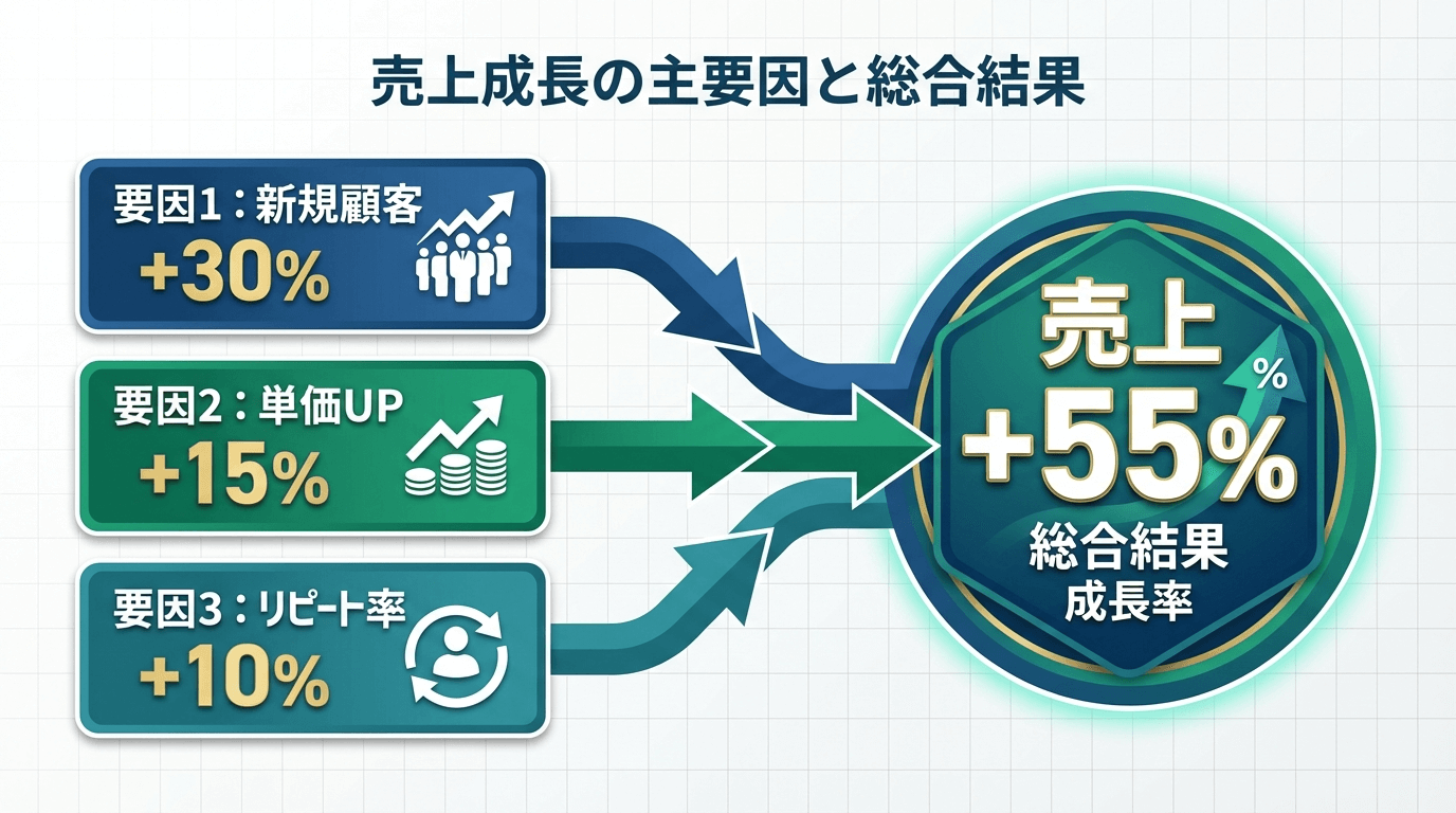 16:9の横長画像。売上増加の3つの要因を矢印図で表現。 左側に「要因1:新規顧客+30%」「要因2:単価UP+15%」「要因3:リピート率+10%」を縦に並べ、右側に「売上+55%」を大きく表示。 矢印で各要因から結果へつなぐ。