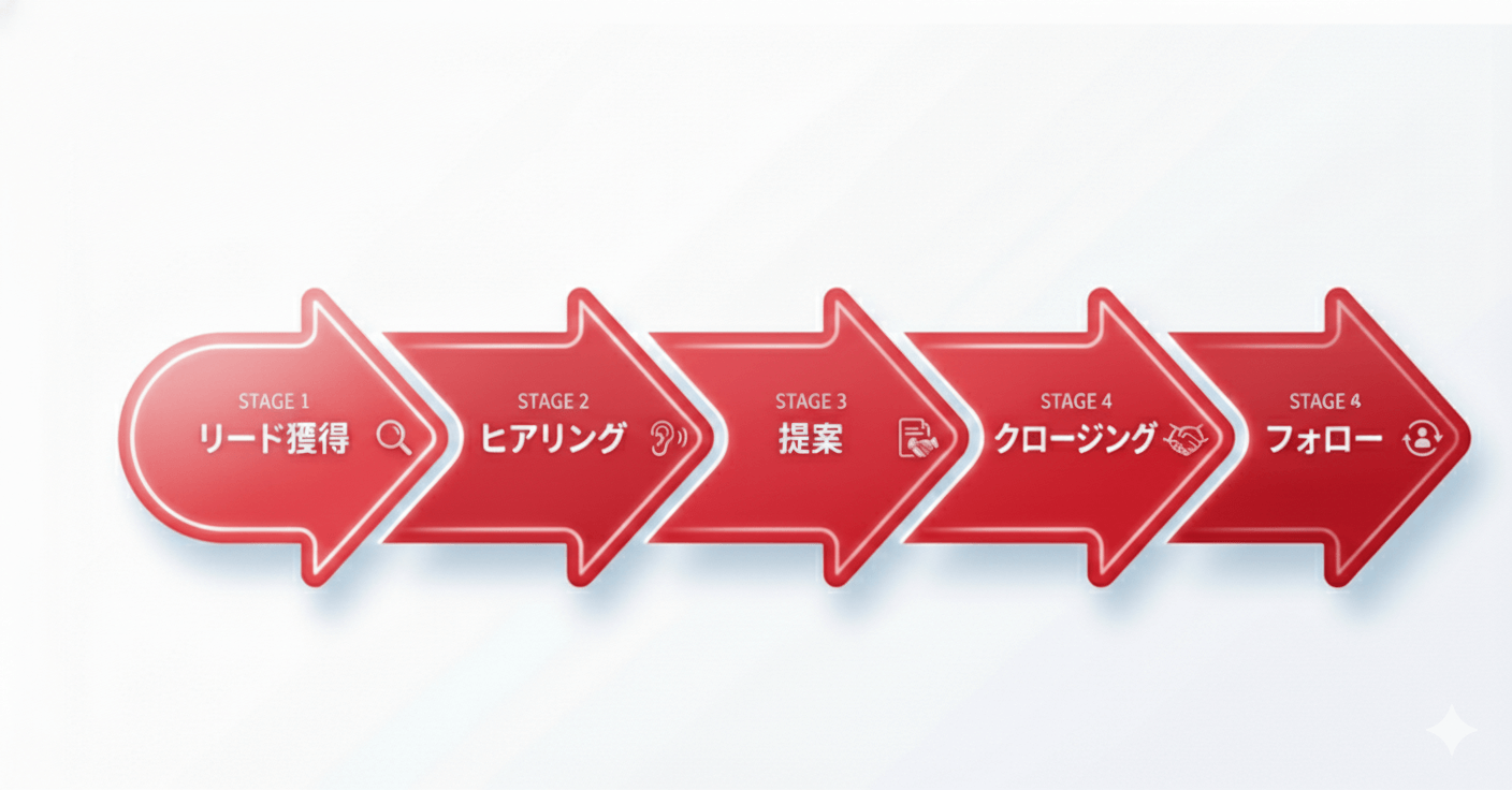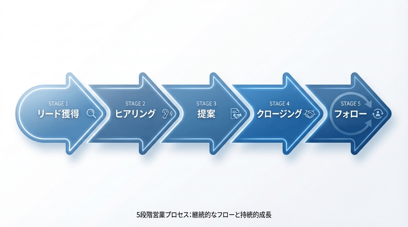 16:9の横長画像。営業プロセスを5段階で示す横向きの矢印図。各段階に「リード獲得」「ヒアリング」「提案」「クロージング」「フォロー」のテキストを入れる。色は青系でシンプルなビジネススタイル。