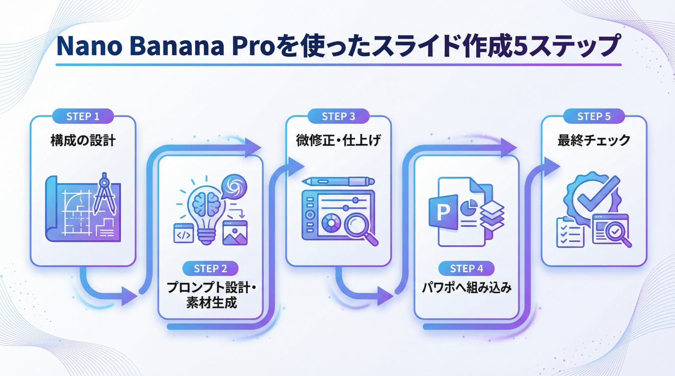 Nano Banana Proを使ったスライド作成は、以下の5ステップで完結します。