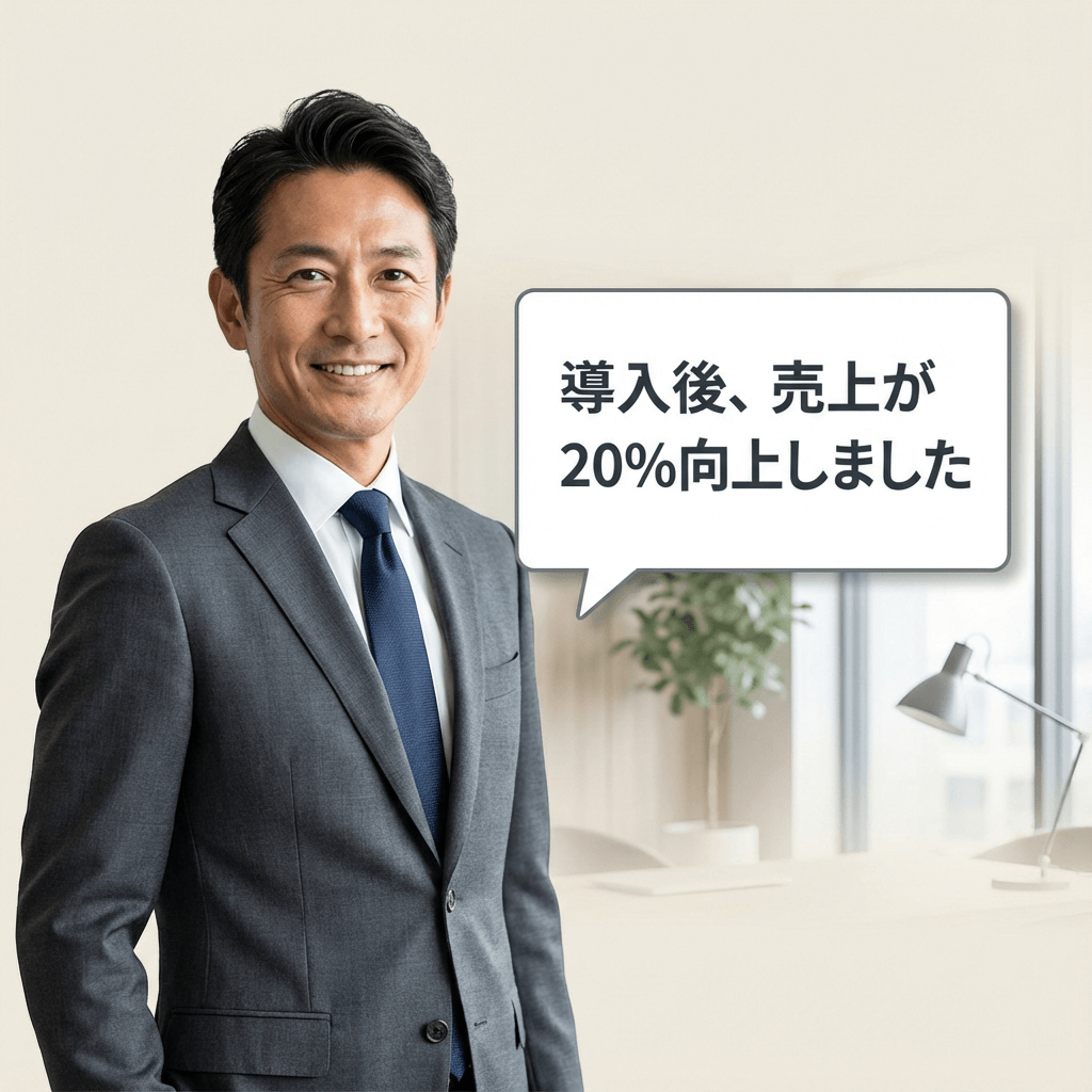 正方形(1:1)の画像。顧客の顔アイコンと吹き出しで「導入後、売上が20%向上しました」というコメント。ビジネスライク。背景は明るいベージュ色。