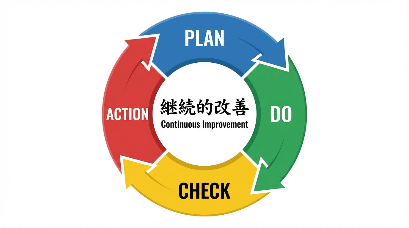 16:9の横長画像。PDCAサイクルを円形の図で表現。 「Plan」「Do」「Check」「Action」の4つを時計回りに配置。 各要素を矢印でつなぎ、中央に「継続的改善」のテキスト。 色は青・緑・黄・赤で各要素を区別。背景は白。