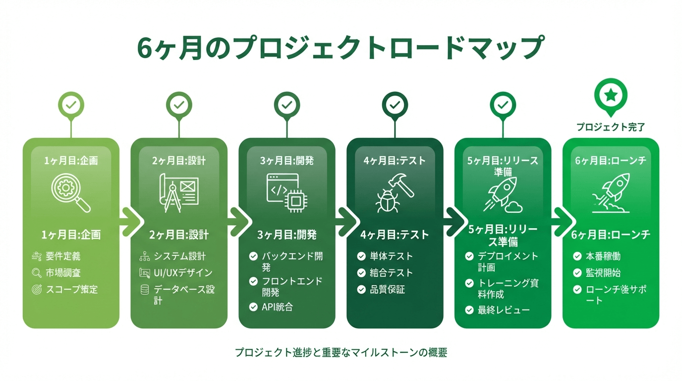 16:9の横長画像。「6ヶ月のプロジェクトロードマップ」。横軸に「1ヶ月目:企画」「2ヶ月目:設計」「3ヶ月目:開発」「4ヶ月目:テスト」「5ヶ月目:リリース準備」「6ヶ月目:ローンチ」。 各フェーズを矢印でつなぎ、マイルストーンを丸印で表示。 色は緑系、シンプルなタイムライン形式。