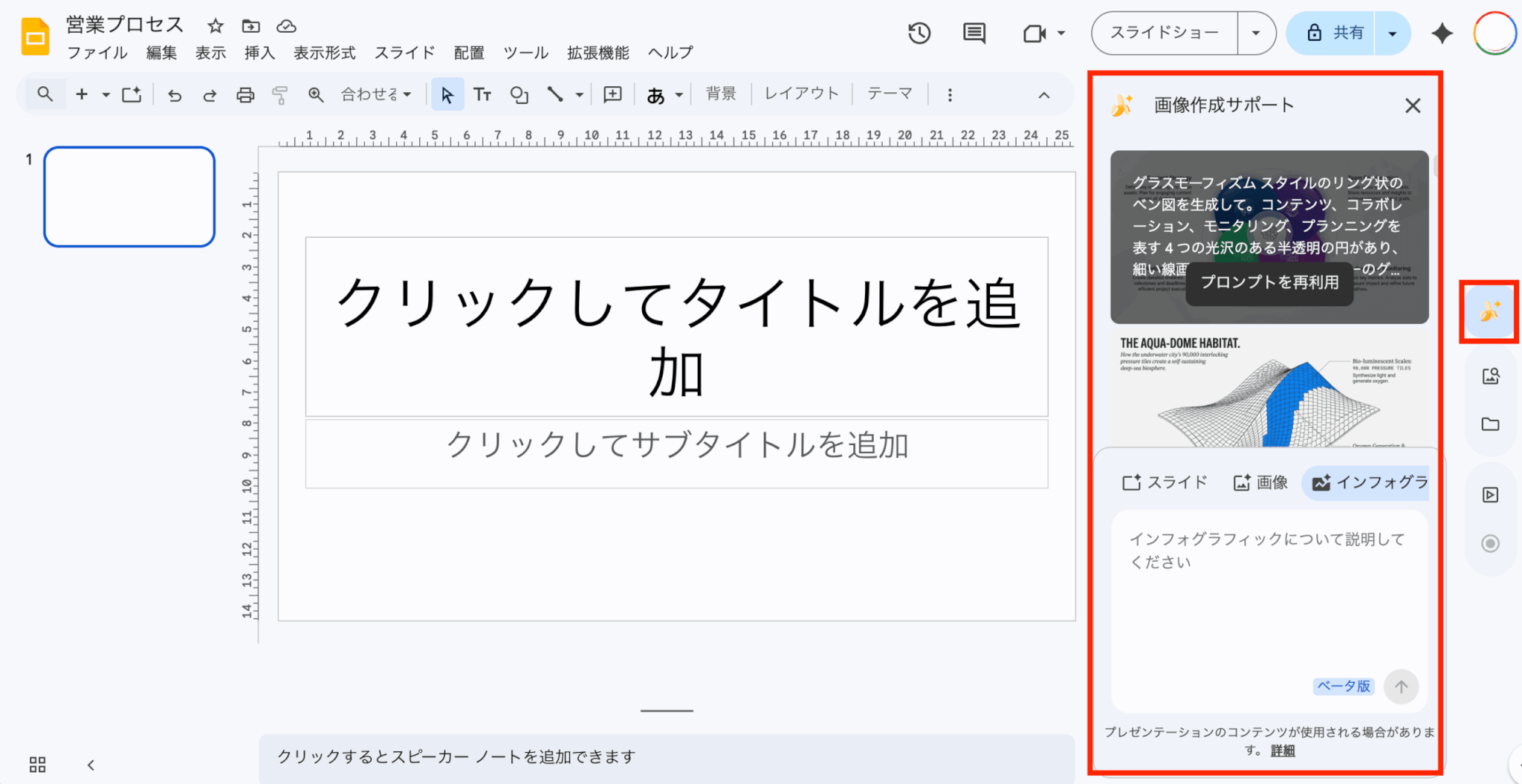 例えば、スライドのタイトルが「営業プロセス」であれば、それに関連した図解やアイコンを自動的に候補として表示するため、プロンプトを一から考える手間が省けます。