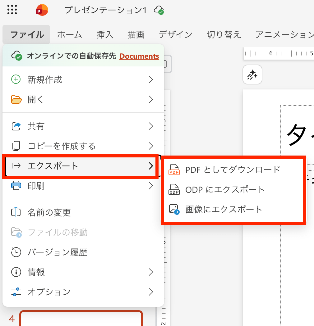 Web版ではファイルから「エクスポート」を開き、該当の形式でダウンロードします。