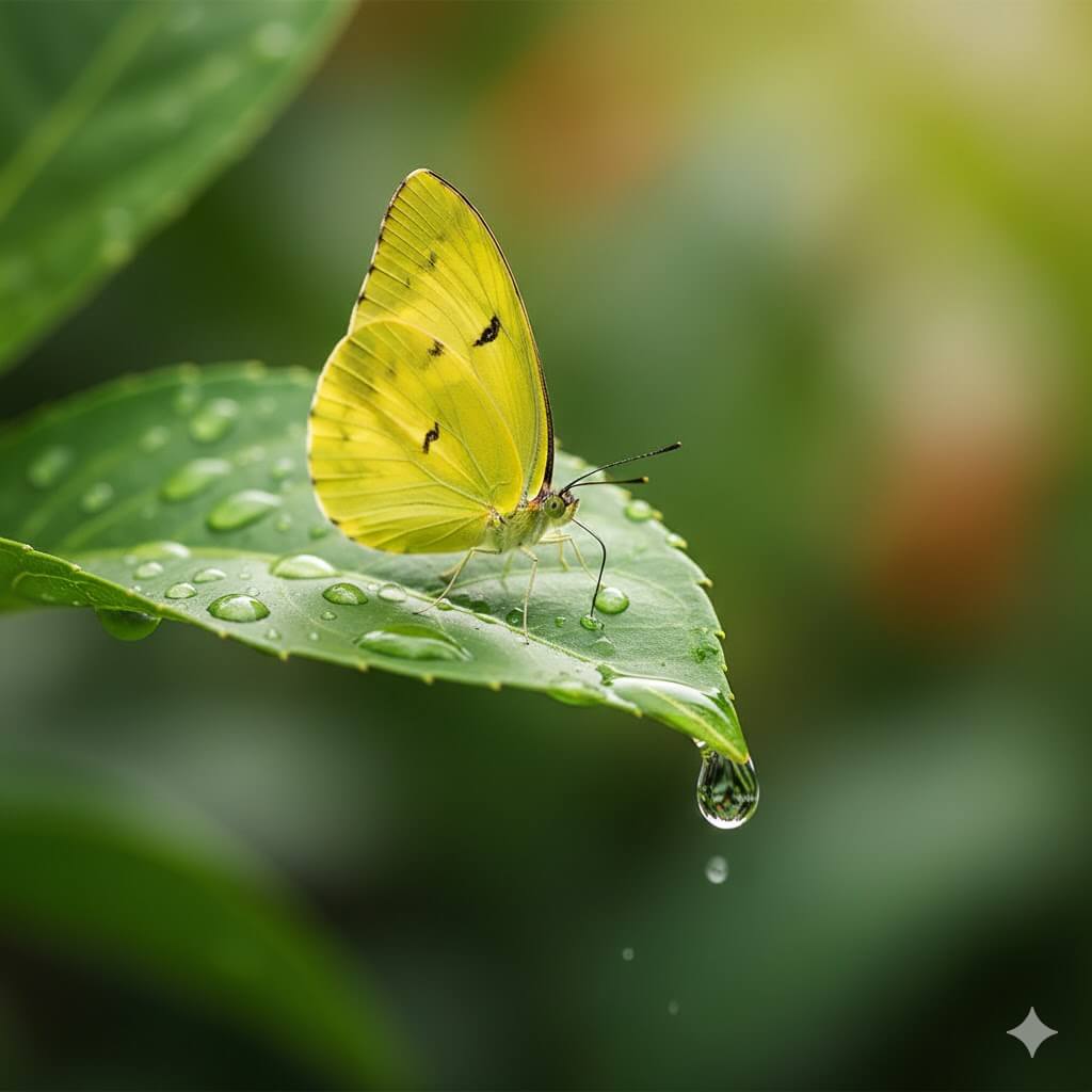 プロンプト「水が滴る葉に蝶が止まっている画像」