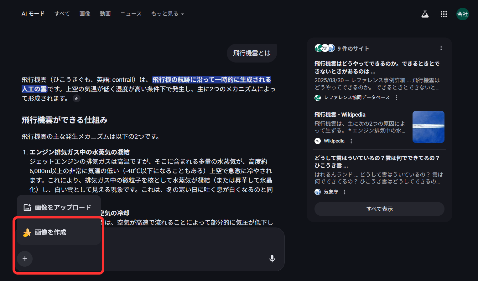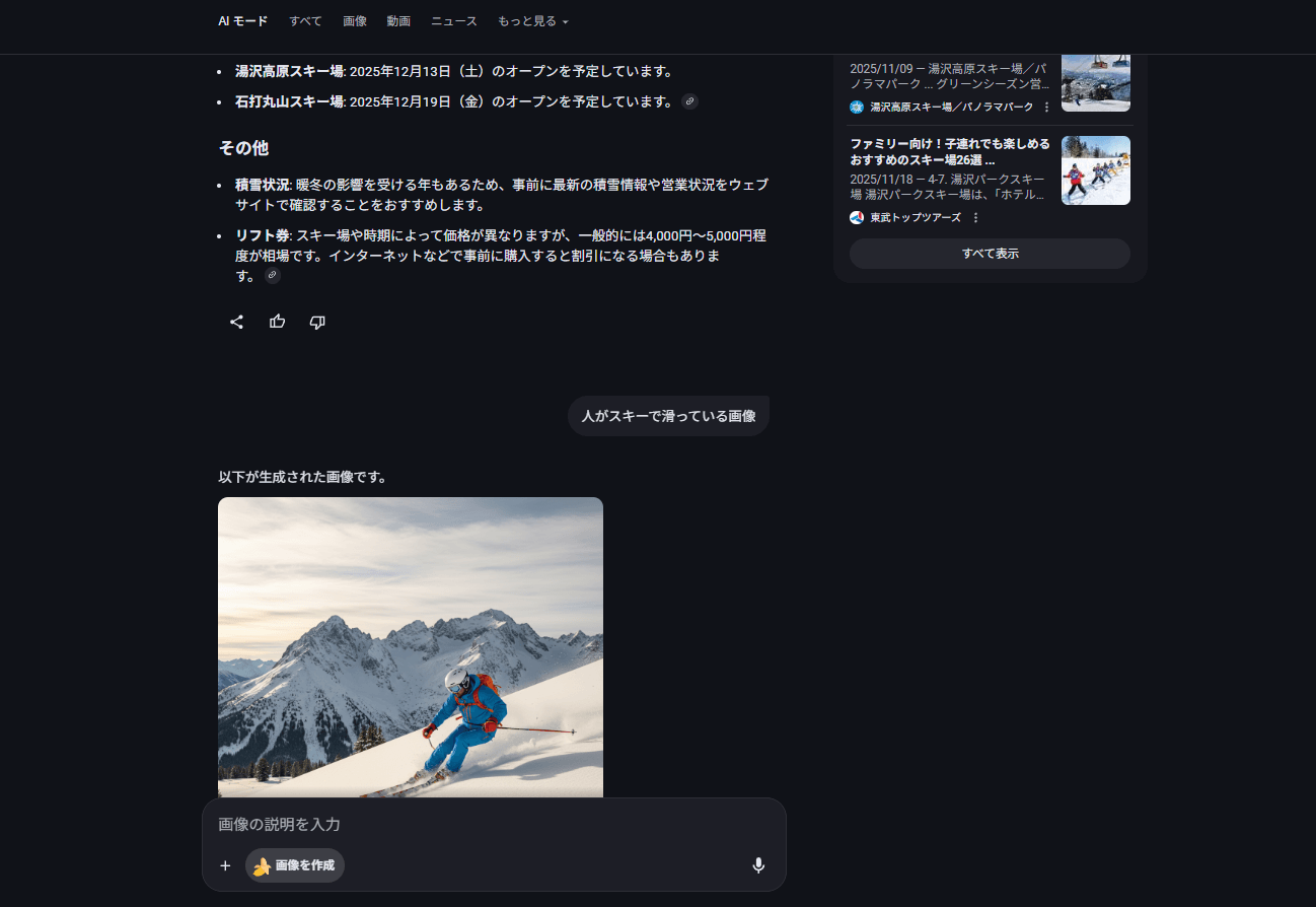 情報検索から画像生成までGoogle検索画面ひとつで進められるため、調査とクリエイティブ作業を並行して行う場面に役立つでしょう。
