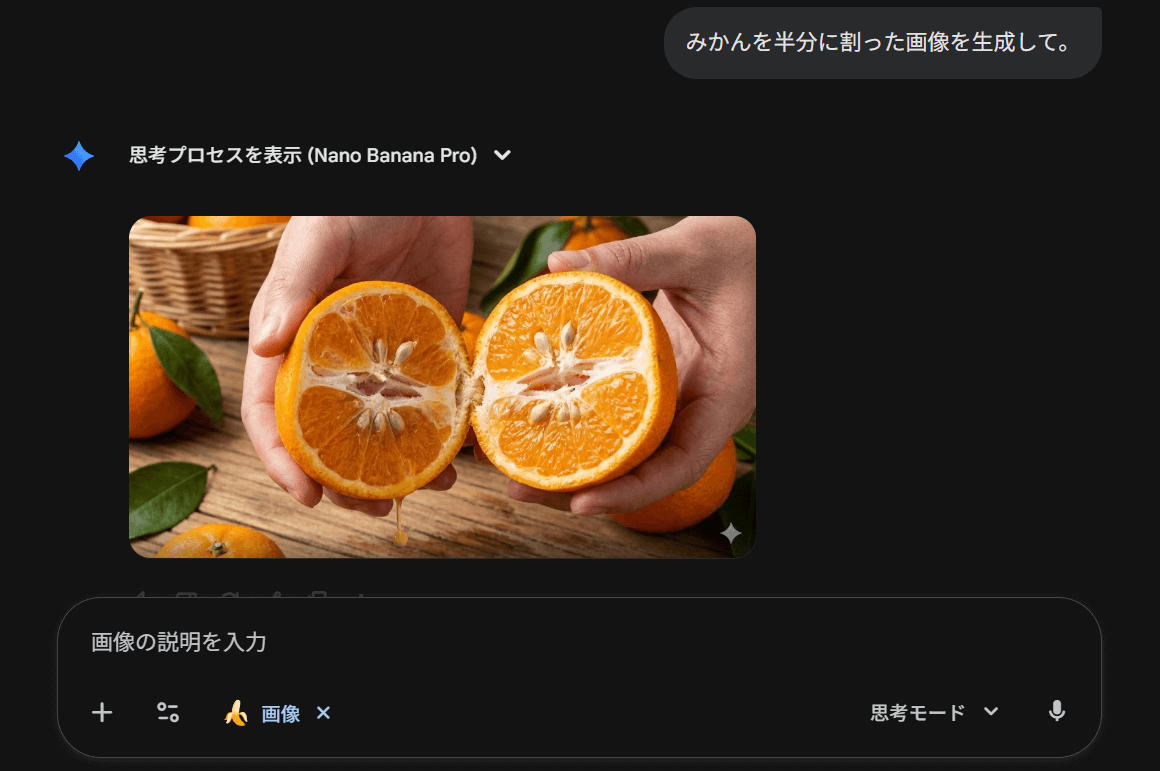 Geminiであれば最も手軽にNano Banana Proを使えます。チャット画面でプロンプトを入力するだけで画像が生成され、生成後に追加の編集指示を出すこともできます。