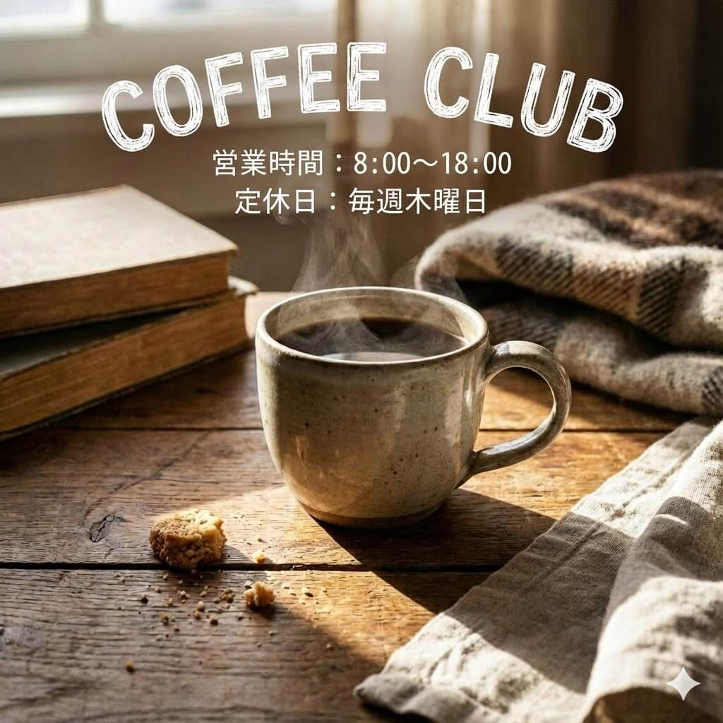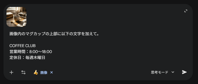 先ほどのコーヒーの画像にテキストを加え、カフェの広告画像を作成してみます。店名・営業時間・定休日の情報をマグカップの上部に配置するようプロンプトを入力し、実行しました。