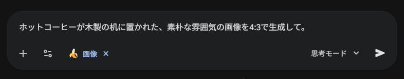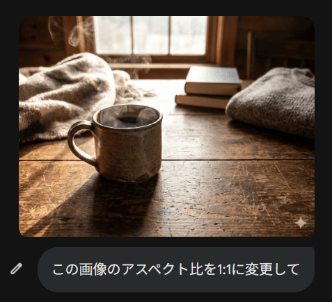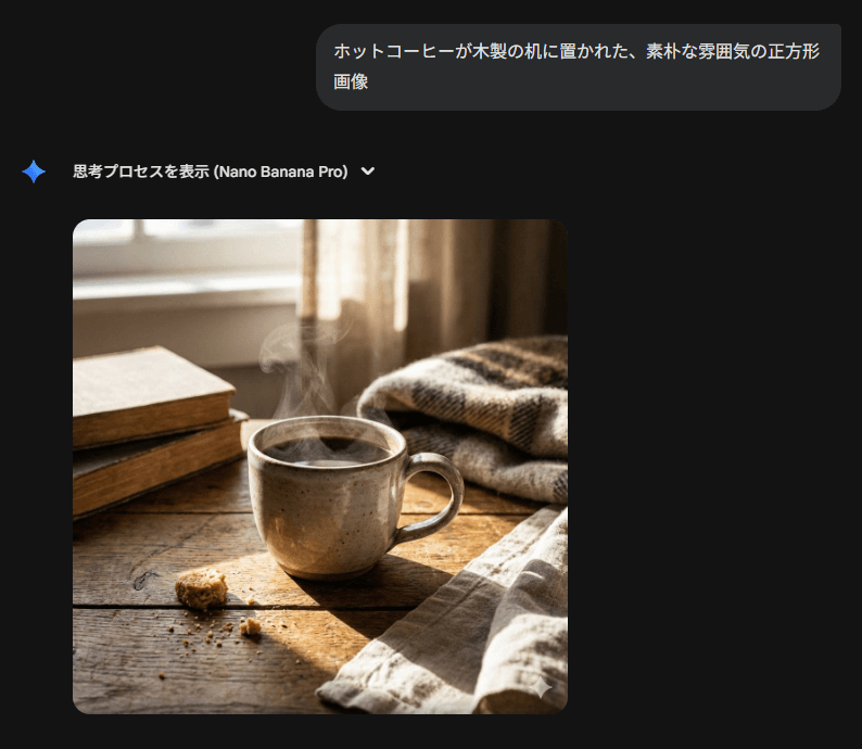 試しに、「ホットコーヒーが木製の机に置かれた、素朴な雰囲気の正方形画像」というプロンプトを実行してみると、20秒ほどで以下のような画像が生成されました。