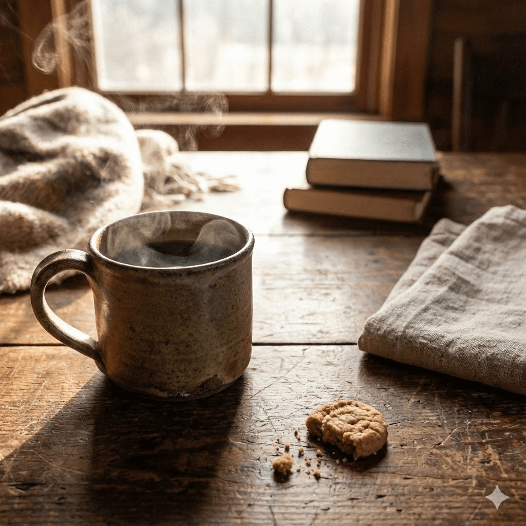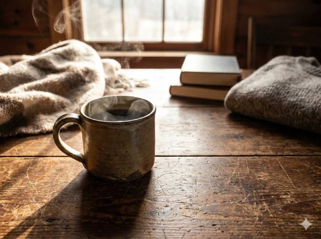 マグカップやカーテンの陰影、マグカップから立ち上る湯気など全体的に自然で違和感のない画像が生成されました。