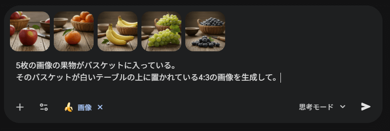実際に、5種類の果物が1枚ずつ写った5枚の写真を組み合わせてみました。プロンプト「5枚の画像の果物がバスケットに入っている。そのバスケットが白いテーブルの上に置かれている4:3の画像を生成して」として実行しました。