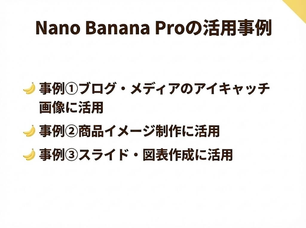 これまでの画像生成AIが苦手だった日本語の文字表現が正確で、説明用のスライド画像や記事タイトル入りの画像などが簡単に生成できるようになりました。用途や目的に応じて使用すれば、Nano Banana Proはさまざまな場面で活躍します。