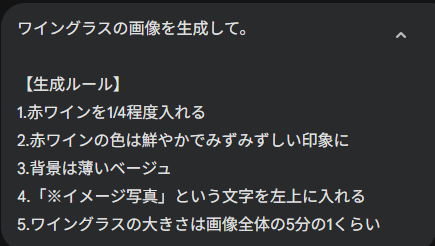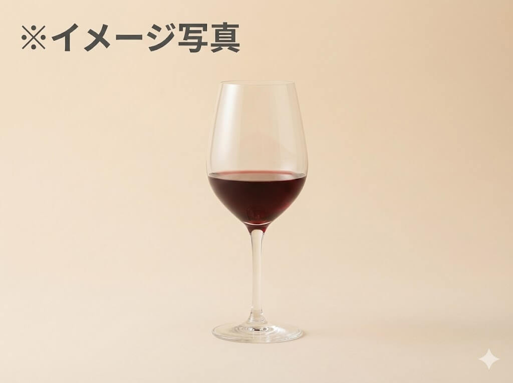 プロンプト「ワイングラスに赤ワインが1/4程度入った、背景が白い画像。左上に「※イメージ写真」と記載」