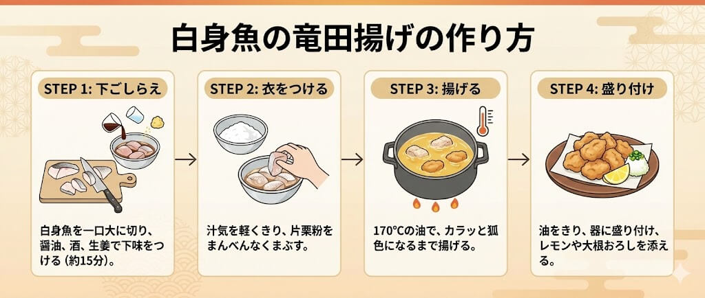 「白身魚の竜田揚げのレシピが書かれた画像を生成して。」というプロンプトで以下の画像を生成しました。