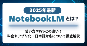 NotebookLMとは?使い方やProとの違い!料金やアプリ化・日本語対応について徹底解説【2025年最新】 Google発の新しいAIリサーチノート「NotebookLM」が話題です。 資料をもとに質問や要約ができる革新的な機能が注目を集めており、2025年現在はProプランの登場や日本語対応、ポッドキャスト風の音声機能、スマホアプリ展開など多彩な進化を遂げています。 本記事では、NotebookLMとは何か、使い方や料金プラン(Pro)も含め、その魅力と実力を多角的に解説します。