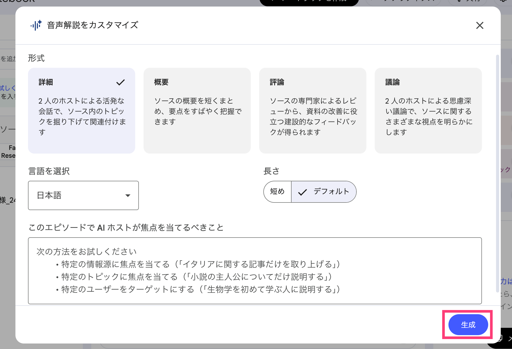 ヒント: NotebookLM では、Google アカウントの設定で指定した言語がデフォルトの出力言語として使用されます。