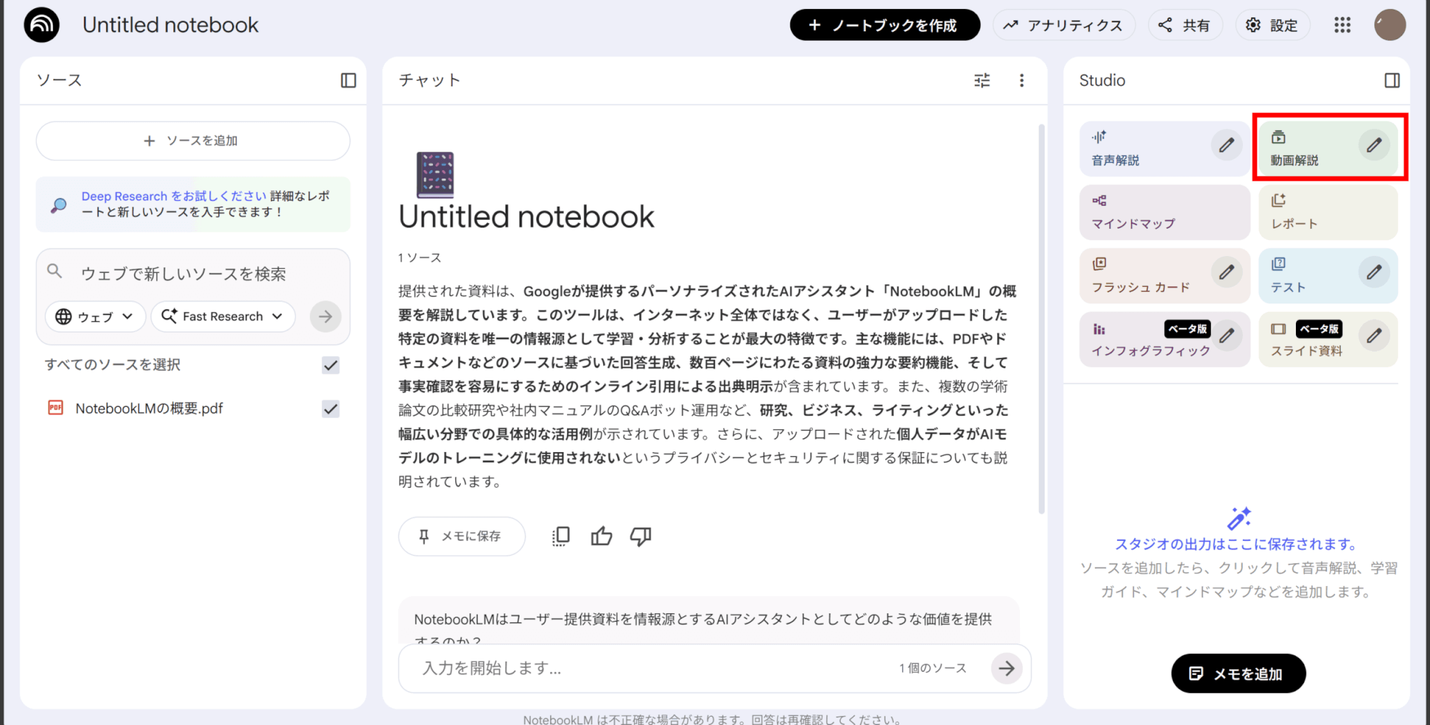 Video Overviewsを使用するには、Audio Overviewsと同じ手順で「動画解説」を選択して生成します。