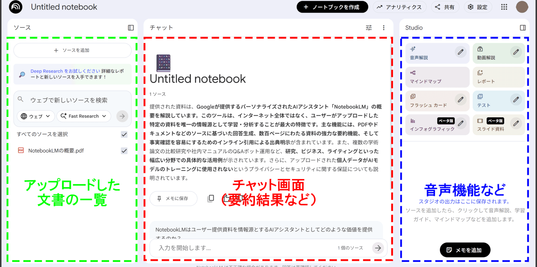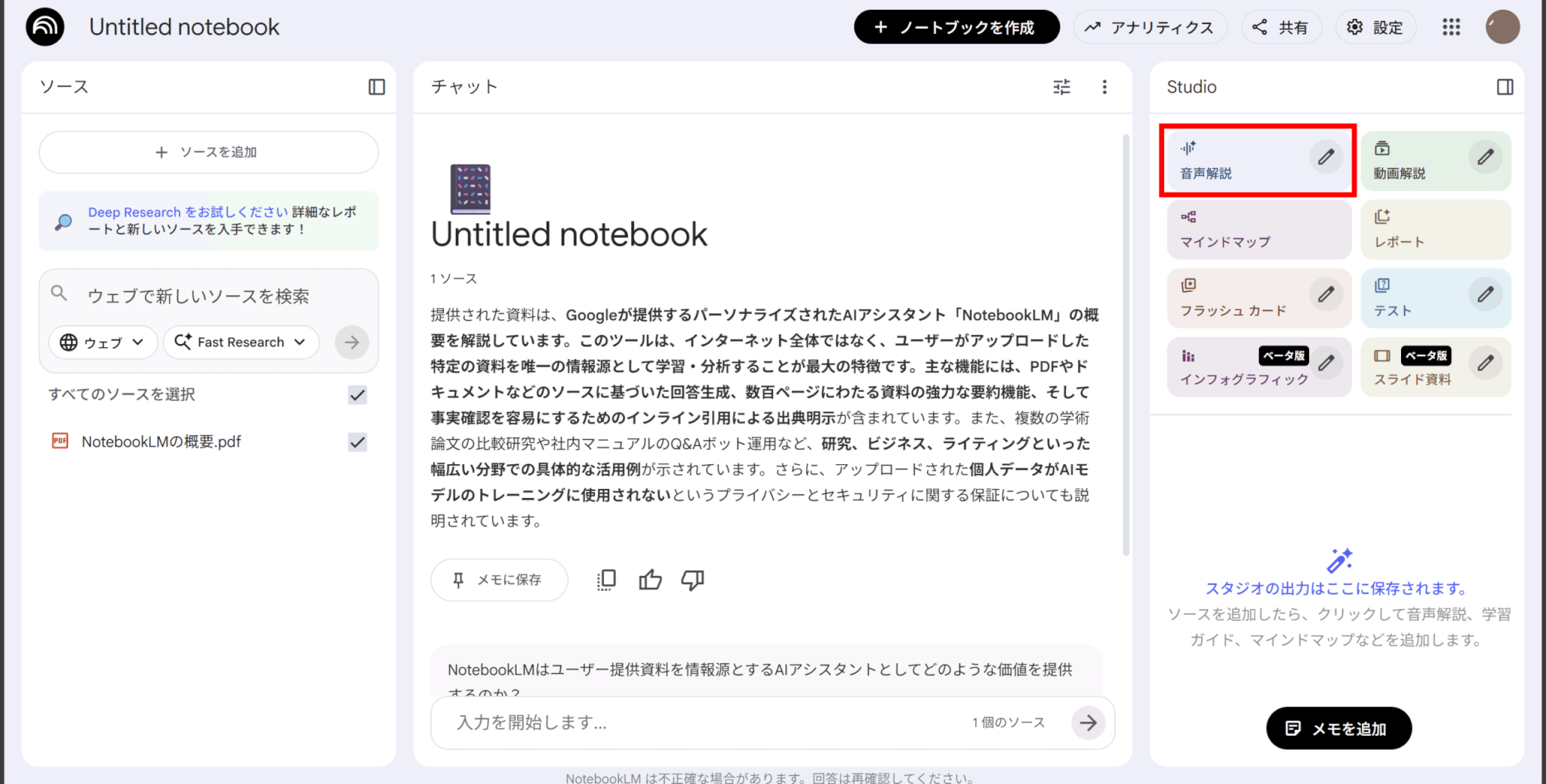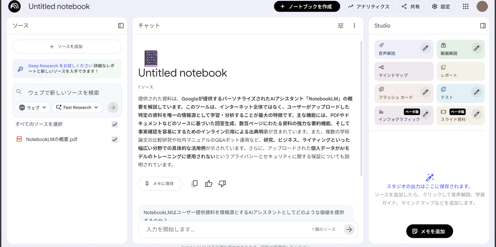 UIは下のように非常にシンプルな構成となっており、右側のStudioパネルではFAQ生成や学習ガイド、音声要約(Audio Overviews)などの派生コンテンツもワンクリックで生成可能です。