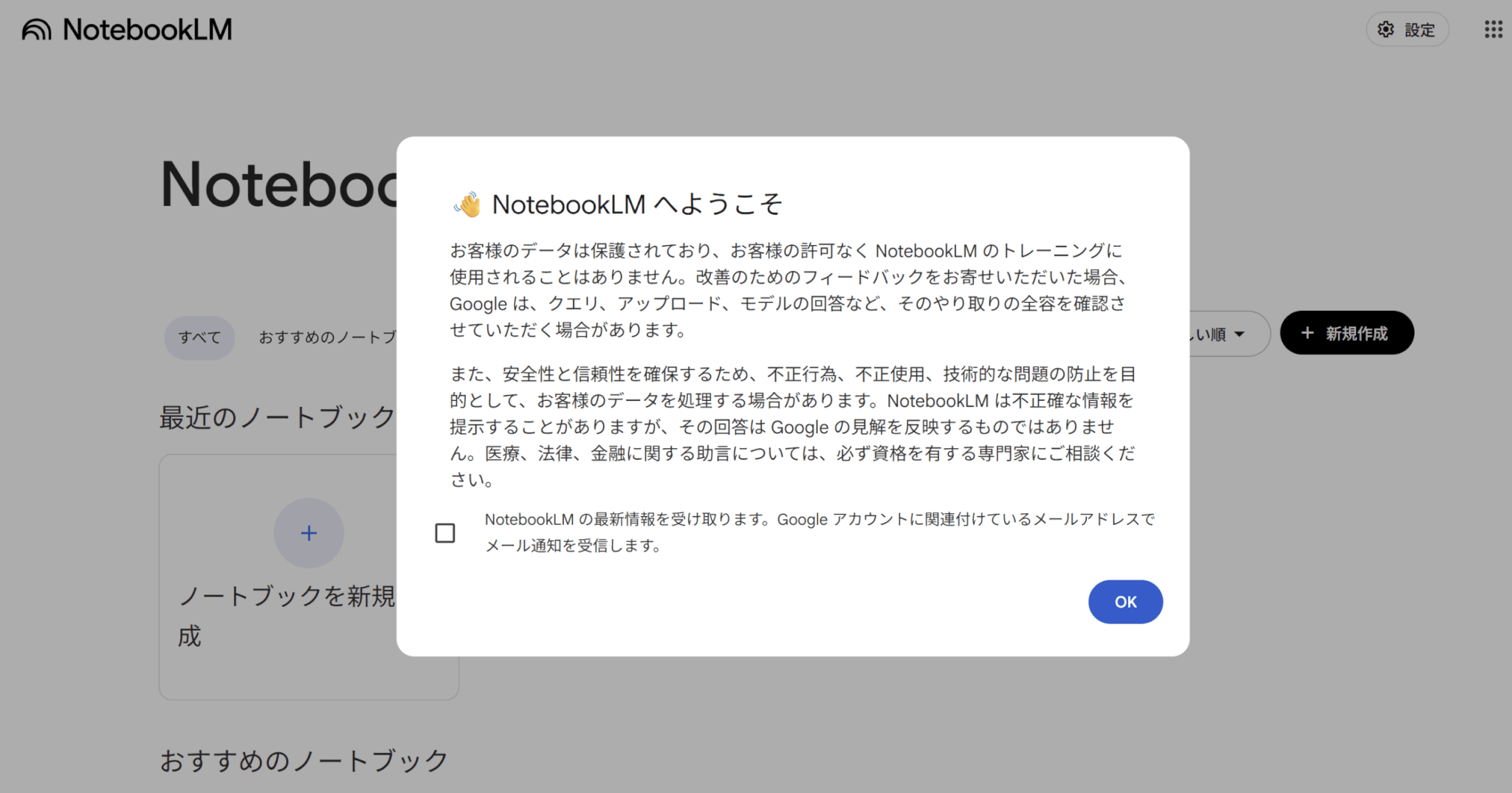 NotebookLMは、下記の手順に沿って、公式サイトにGoogleアカウントでログインするだけで利用を開始できます。