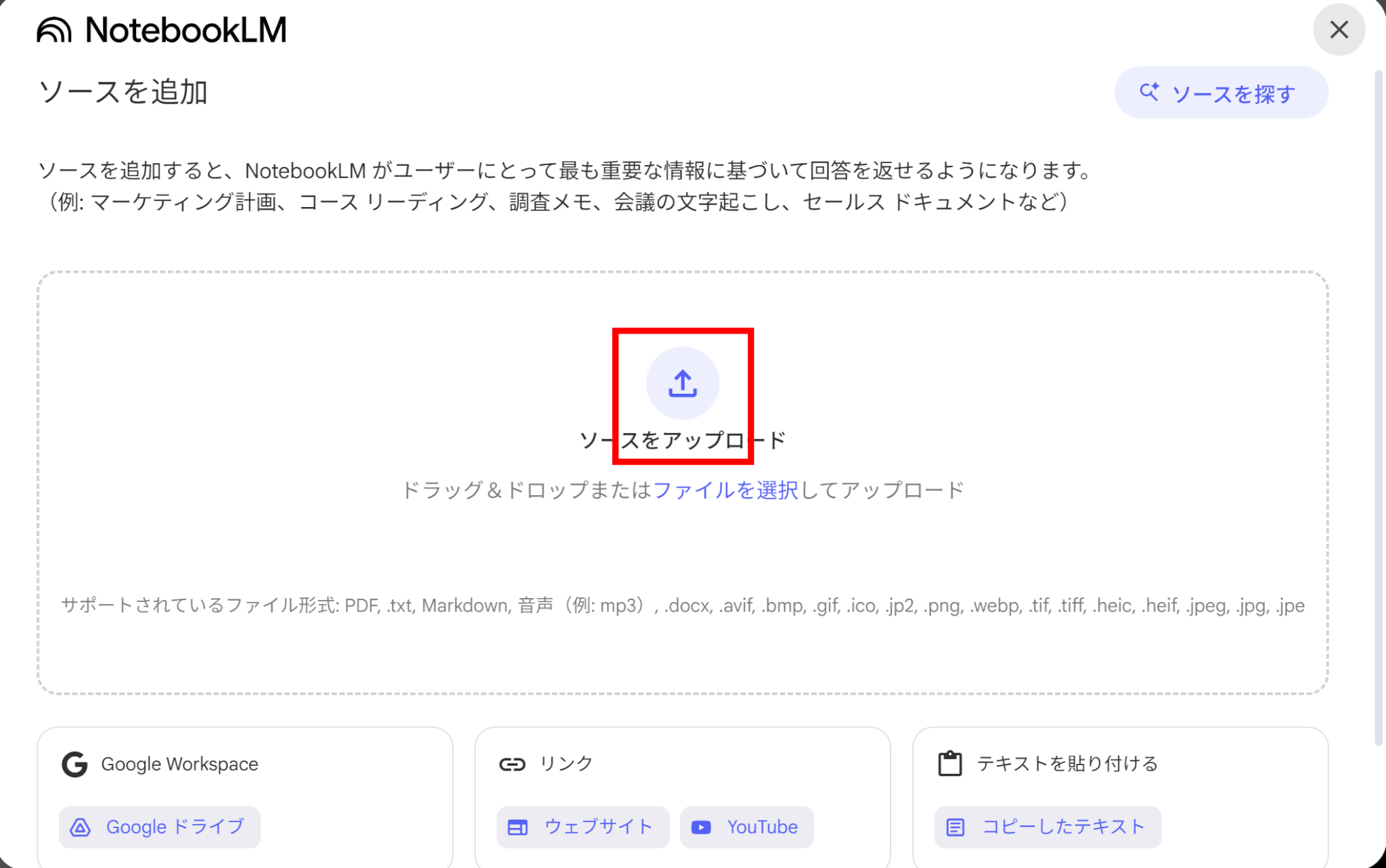 「ソースを追加」画面が表示されますので、ドラッグ&ドロップ、もしくは、ファイル選択アイコンからファイルをアップロードします。