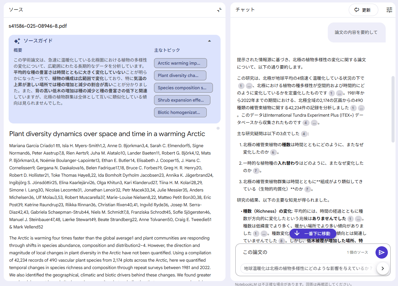 中央のチャット画面では、アップロードしたテキストの内容に基づいて要約・質問などを行うことができます。