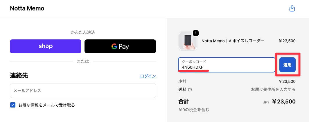 クーポンコードの入力方法