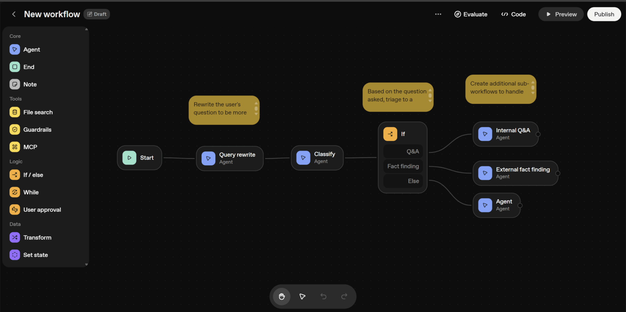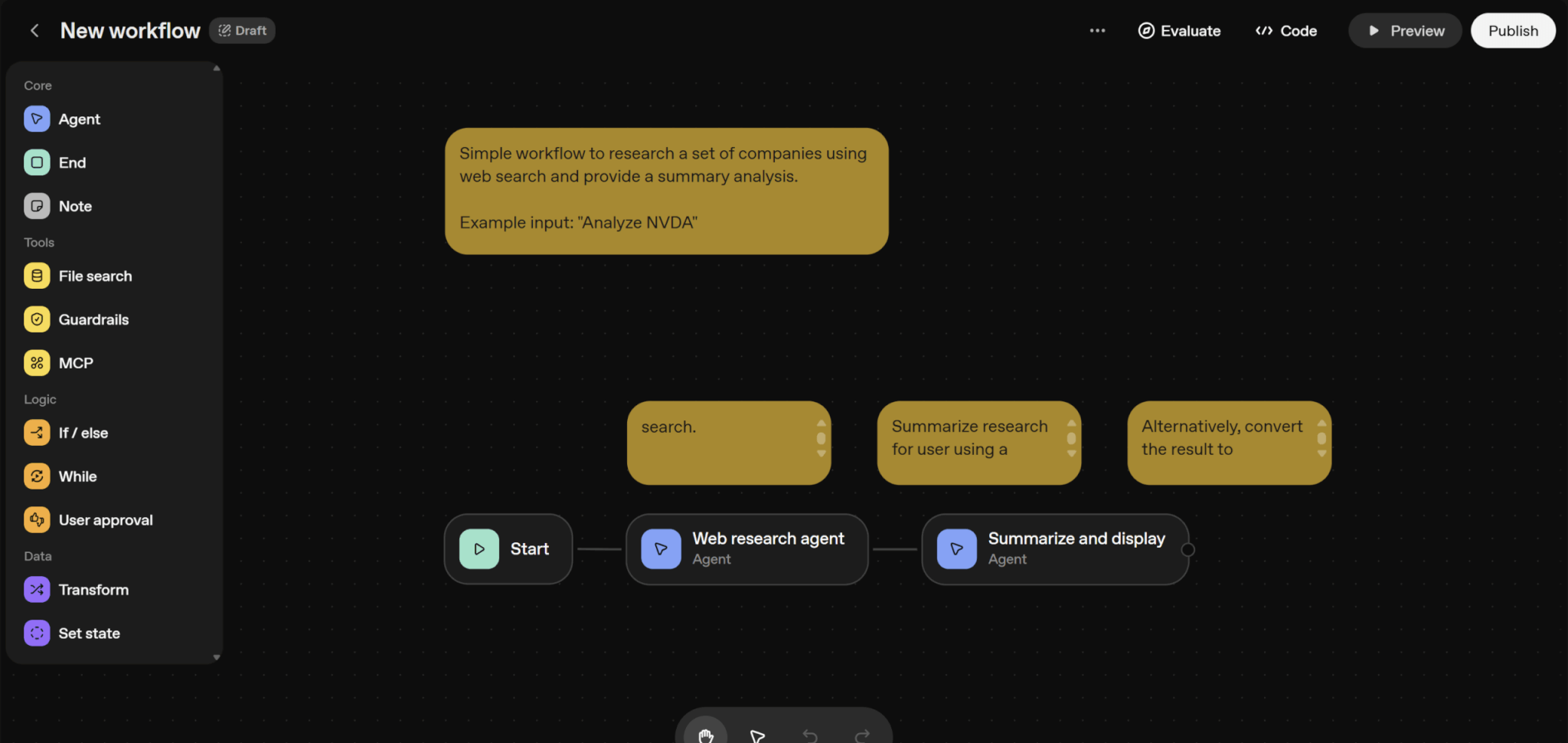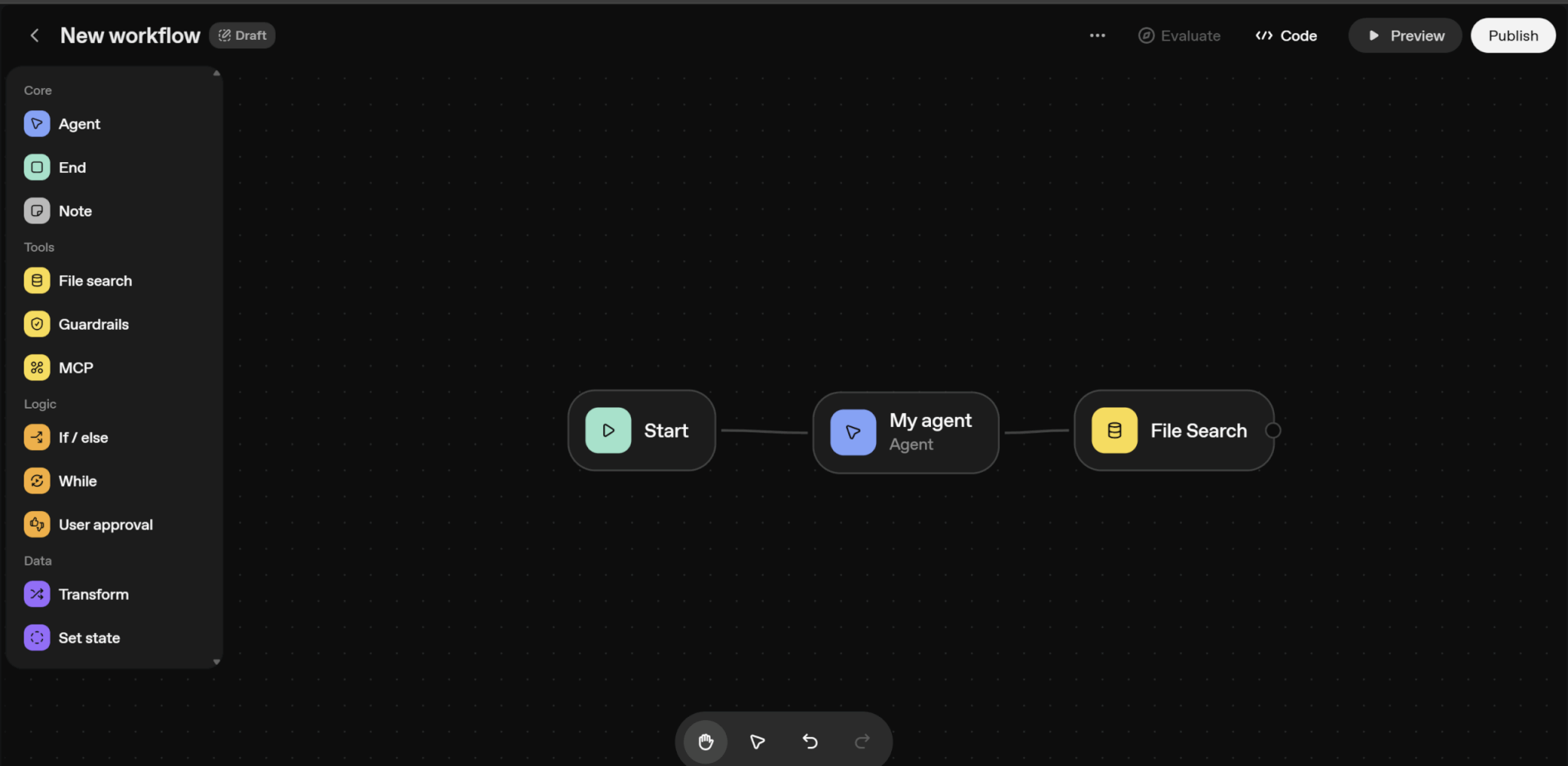 OpenAIのAgent Builderは、ビジュアルキャンバス上にノードを配置することでAIエージェントを構築できるツールです。