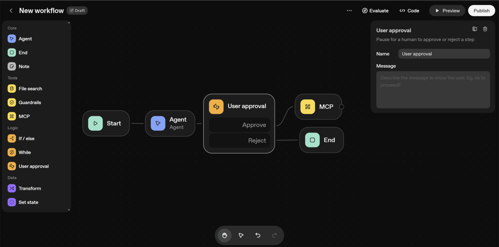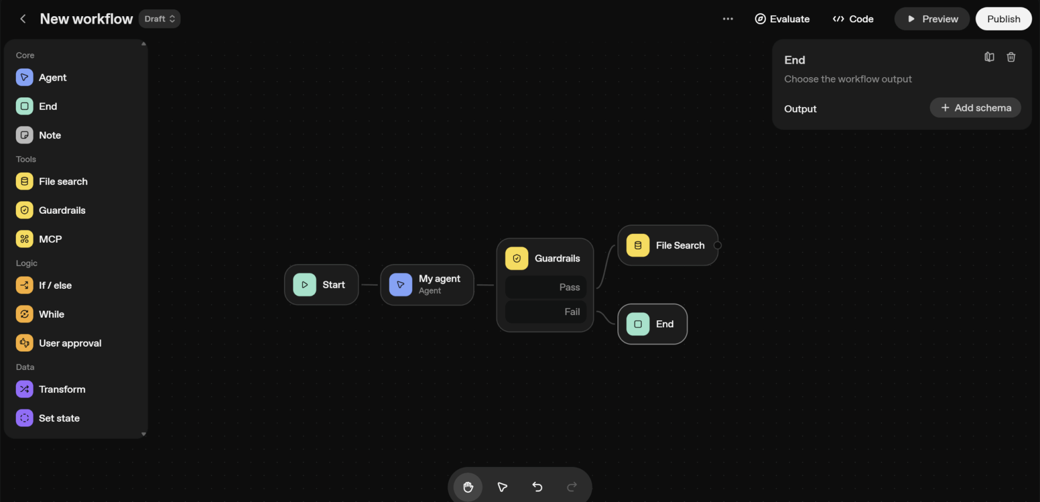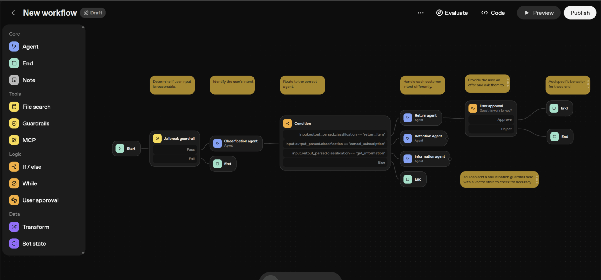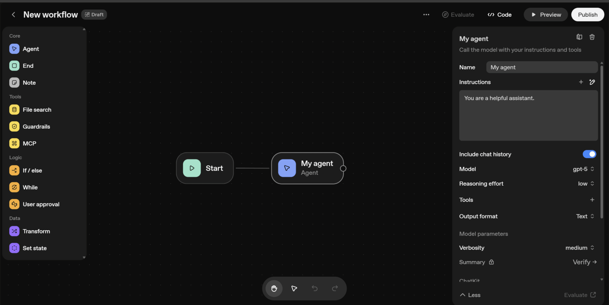 OpenAIのAgent Builderは、ビジュアルキャンバス上にノードを配置することでAIエージェントを構築できるツールです。
