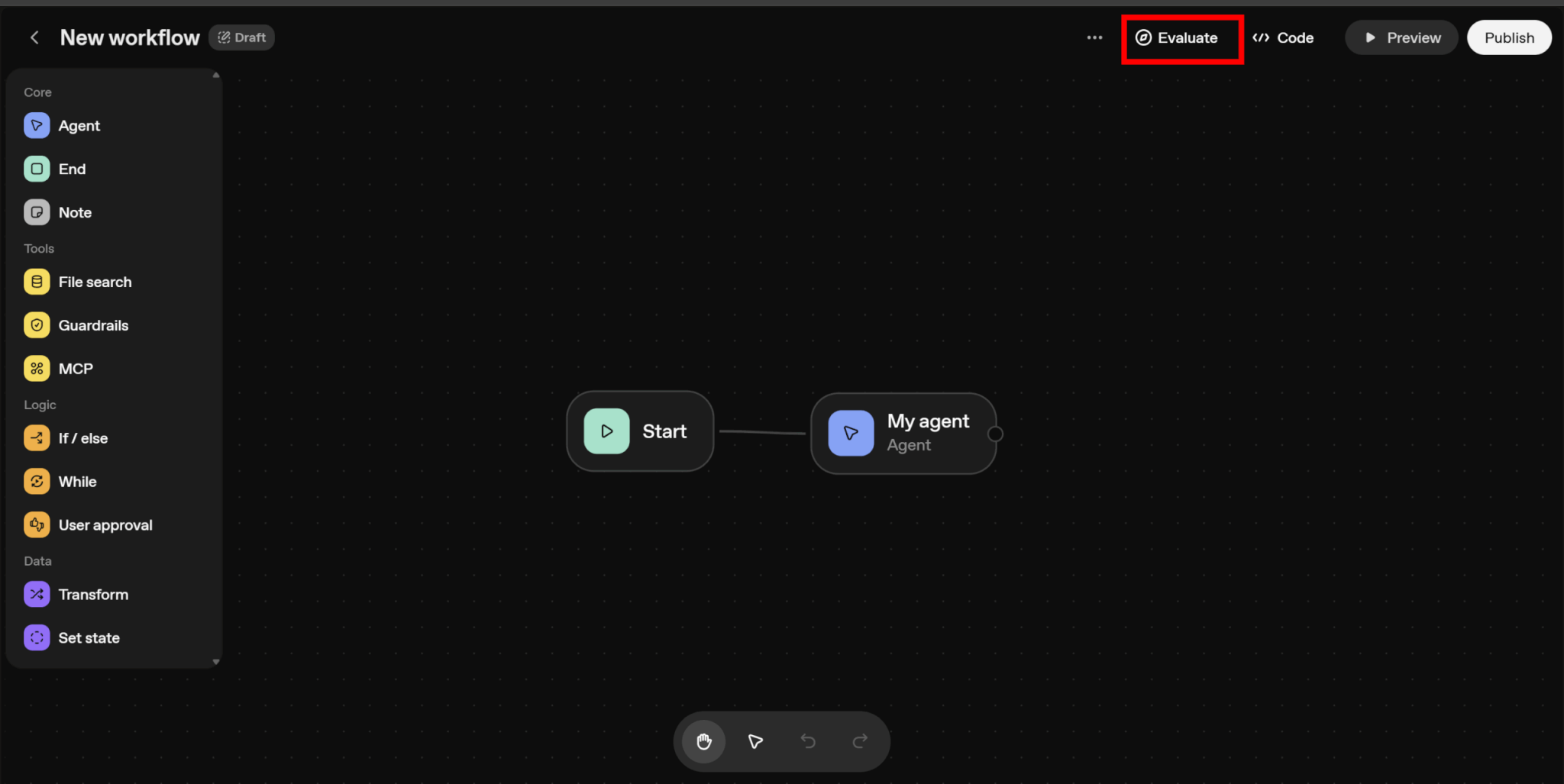 画面右上の「Evaluate」をクリックすると、作成したワークフローを評価できます。