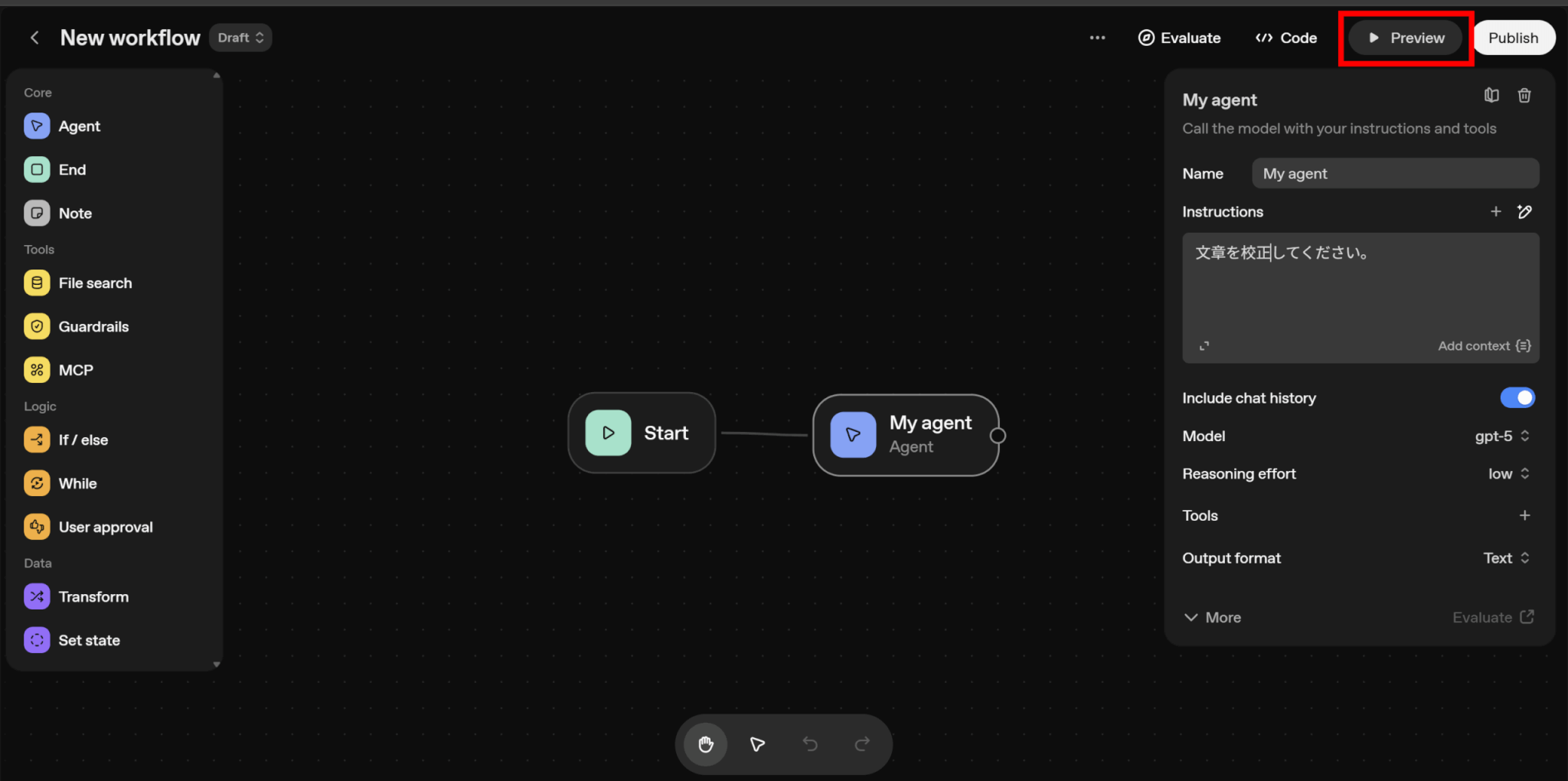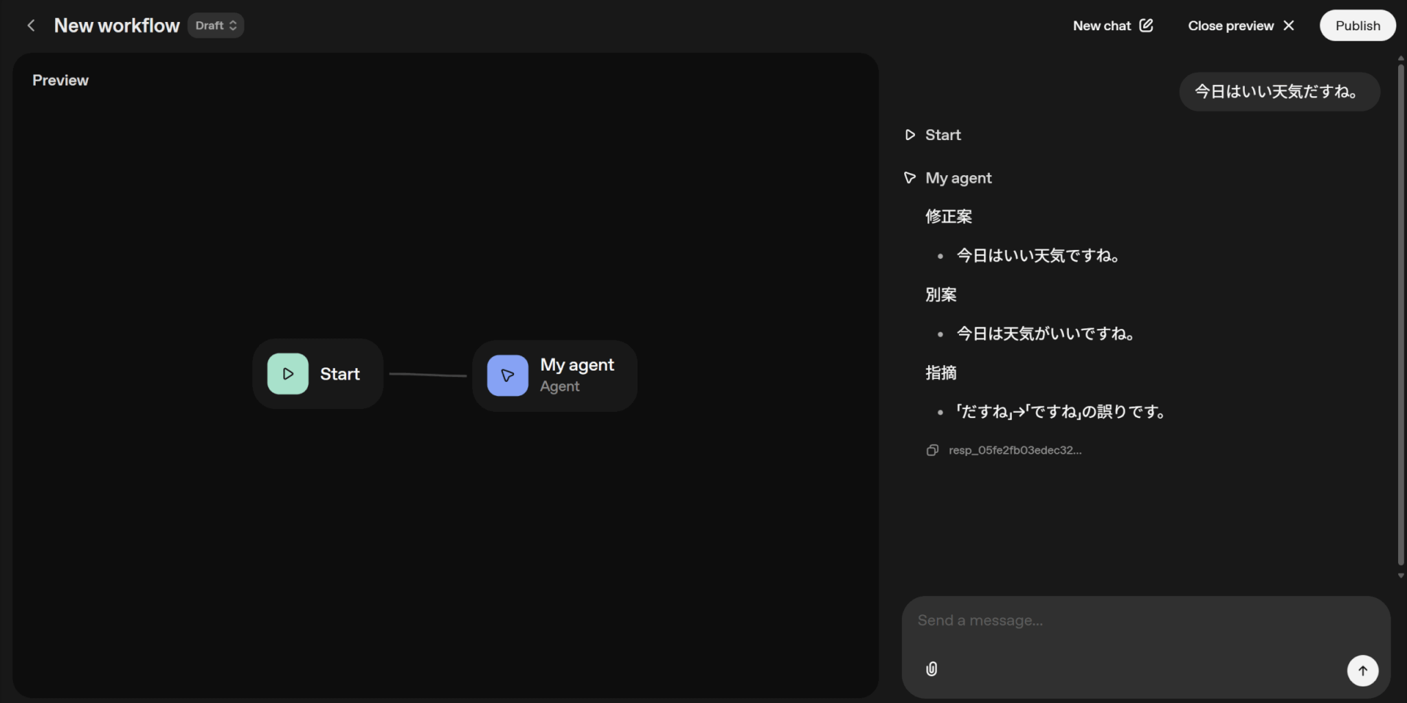 今回はAgentノードに「文章を校正してください。」という指示を与え、文章校正を行うエージェントを作成しました。