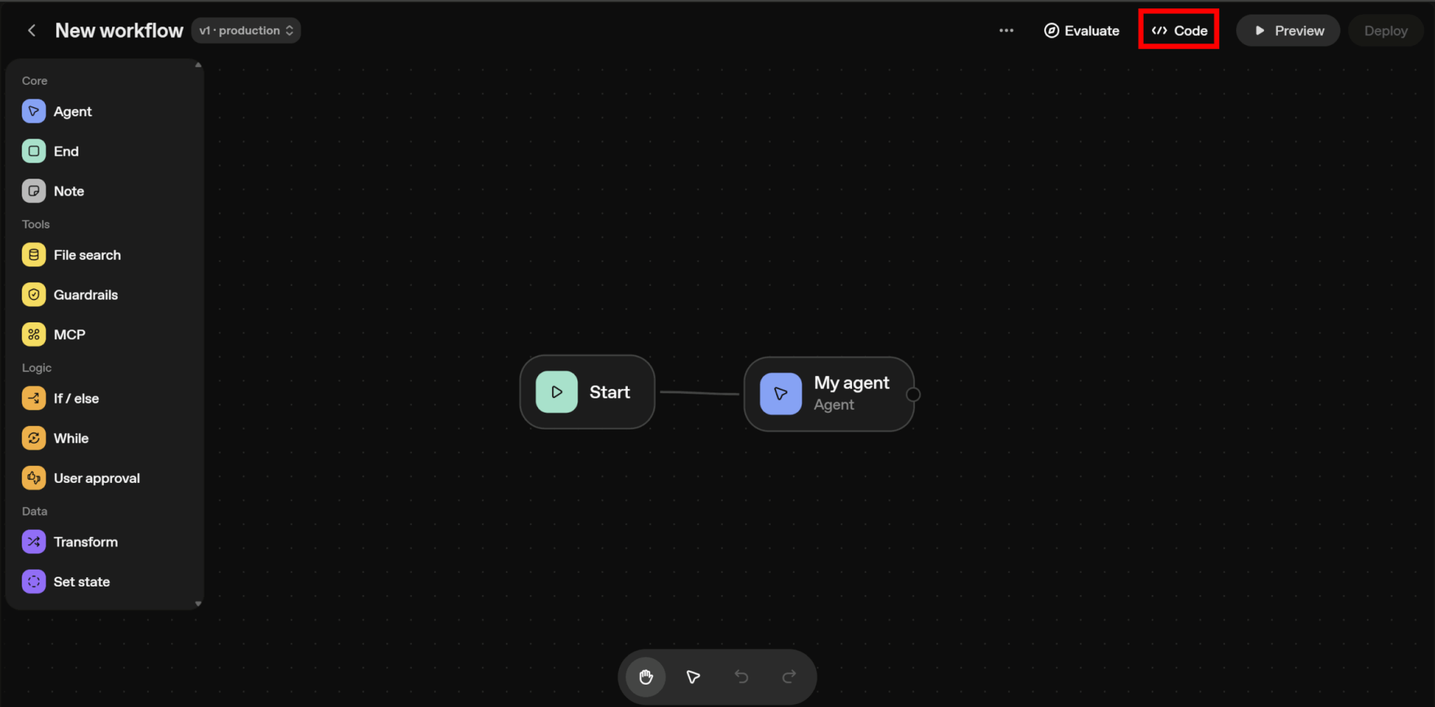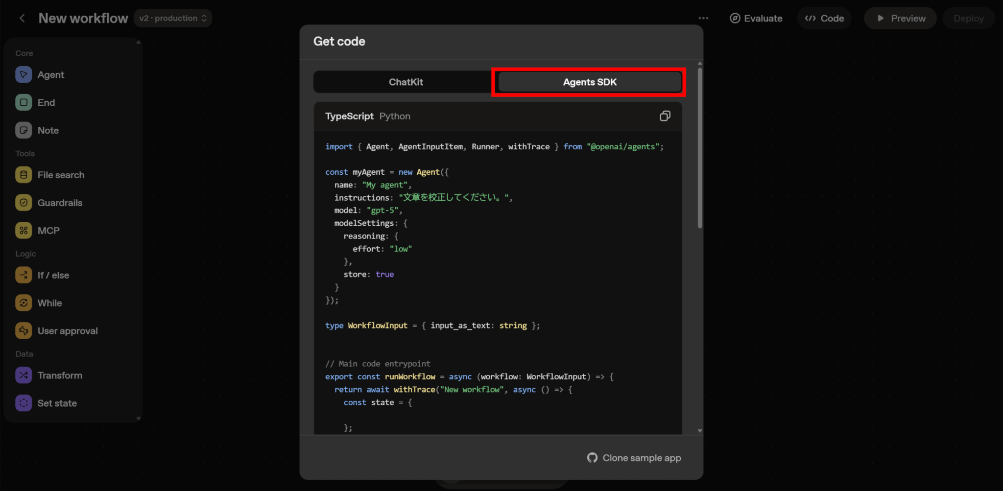 Agent Builderのビジュアルキャンバスで構築したエージェントは、Agents SDK用のコードとしてエクスポートできます。
