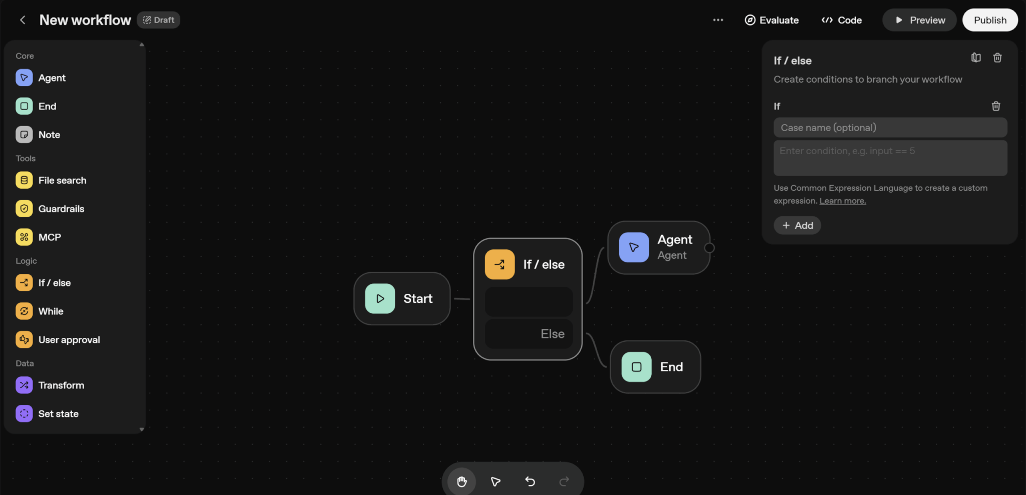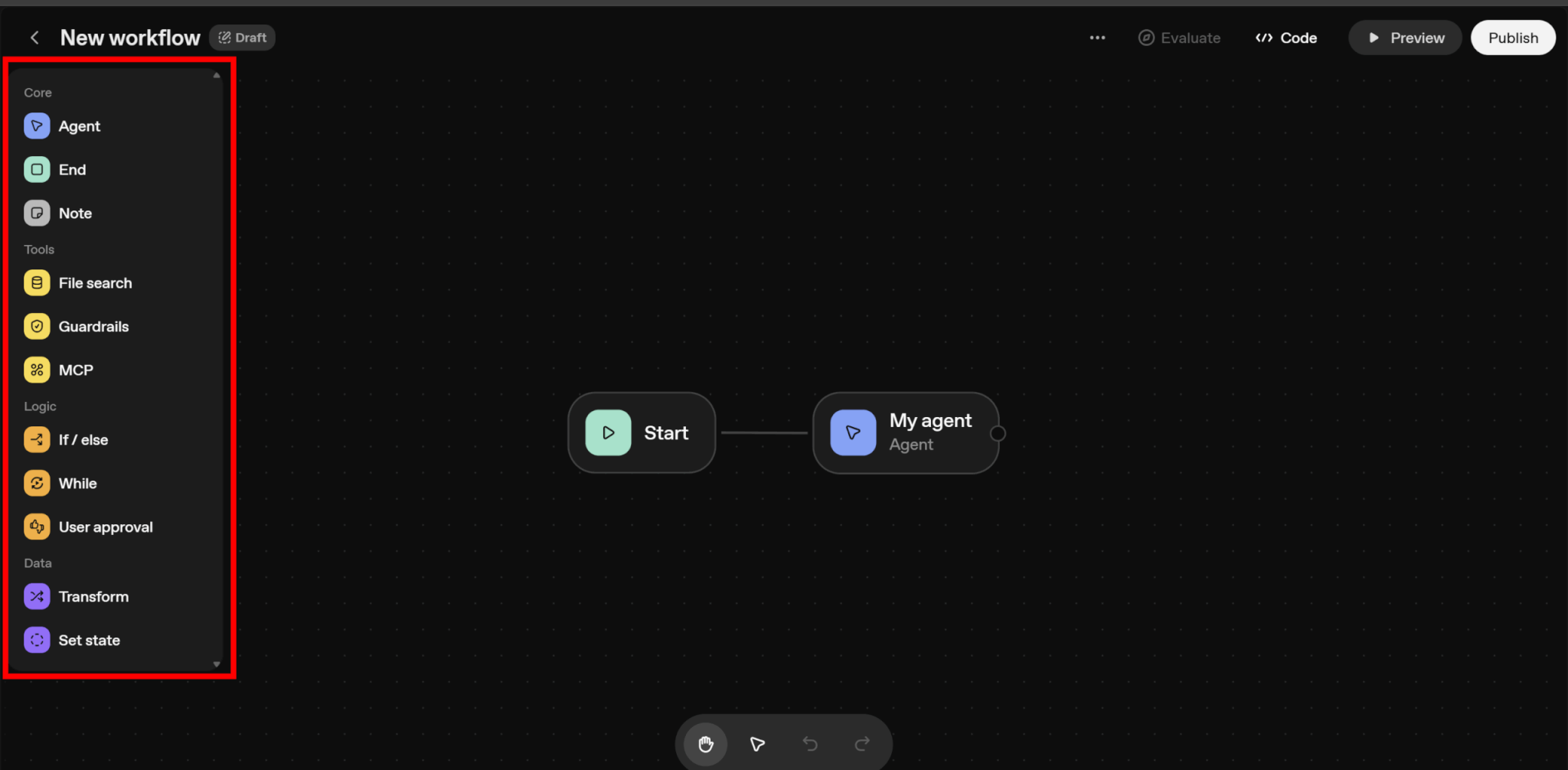 Agent Builderでは、ビジュアルキャンバス上でノードをドラッグ&ドロップしてエージェントの処理を構成します。