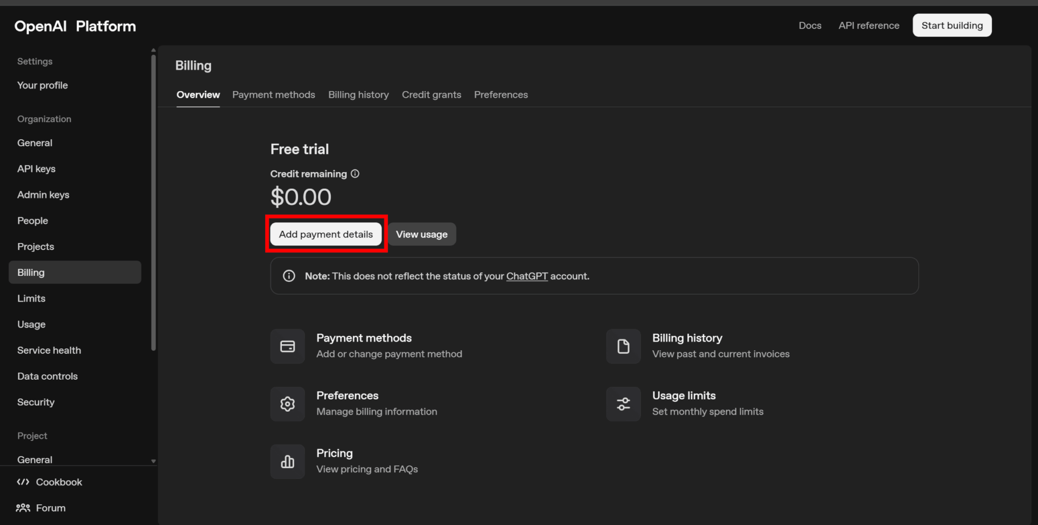 OpenAI Platformで支払方法の設定まで済んでいる方は、このセクションは飛ばしてください。