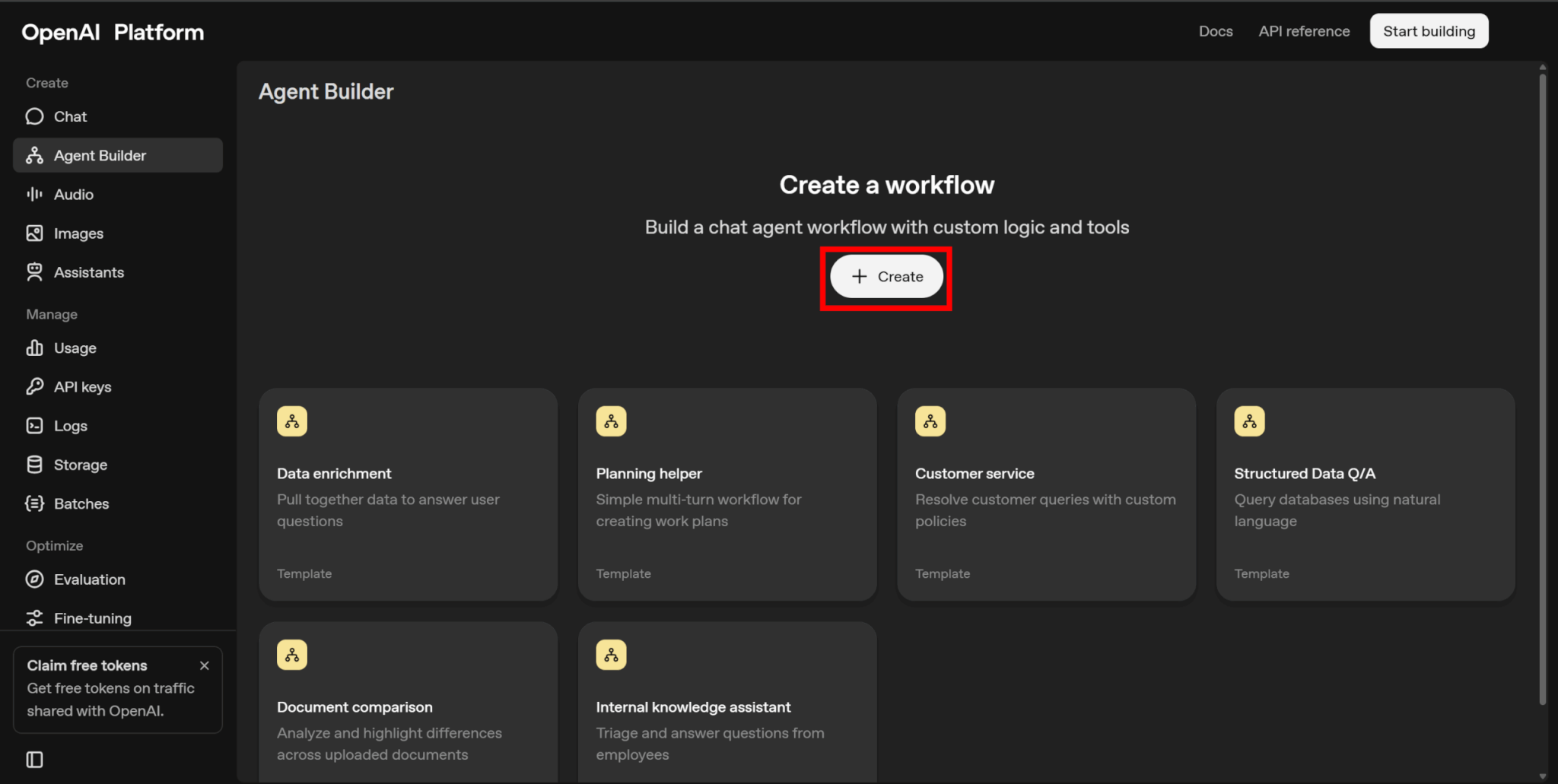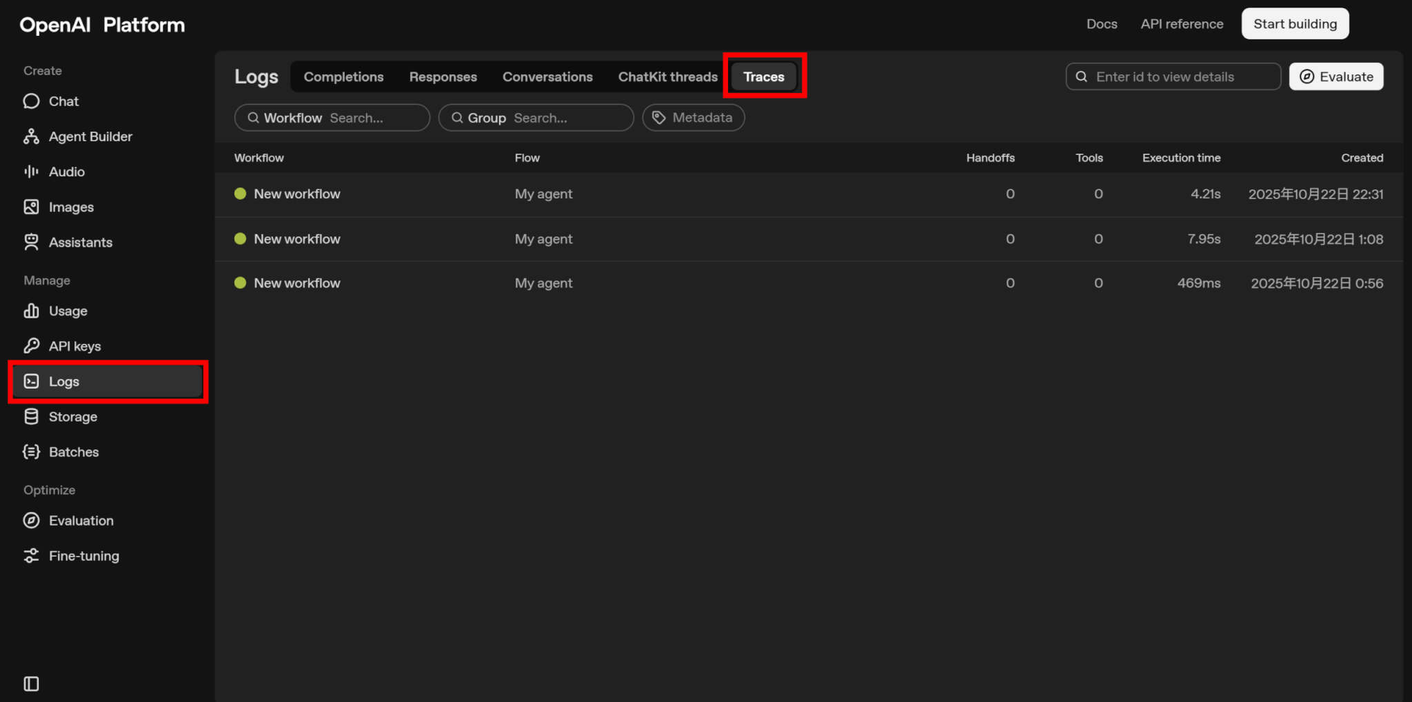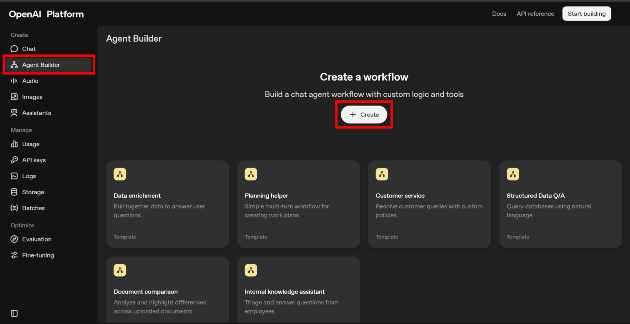 まずはOpenAI Platform内のAgent Builderにアクセスしましょう。