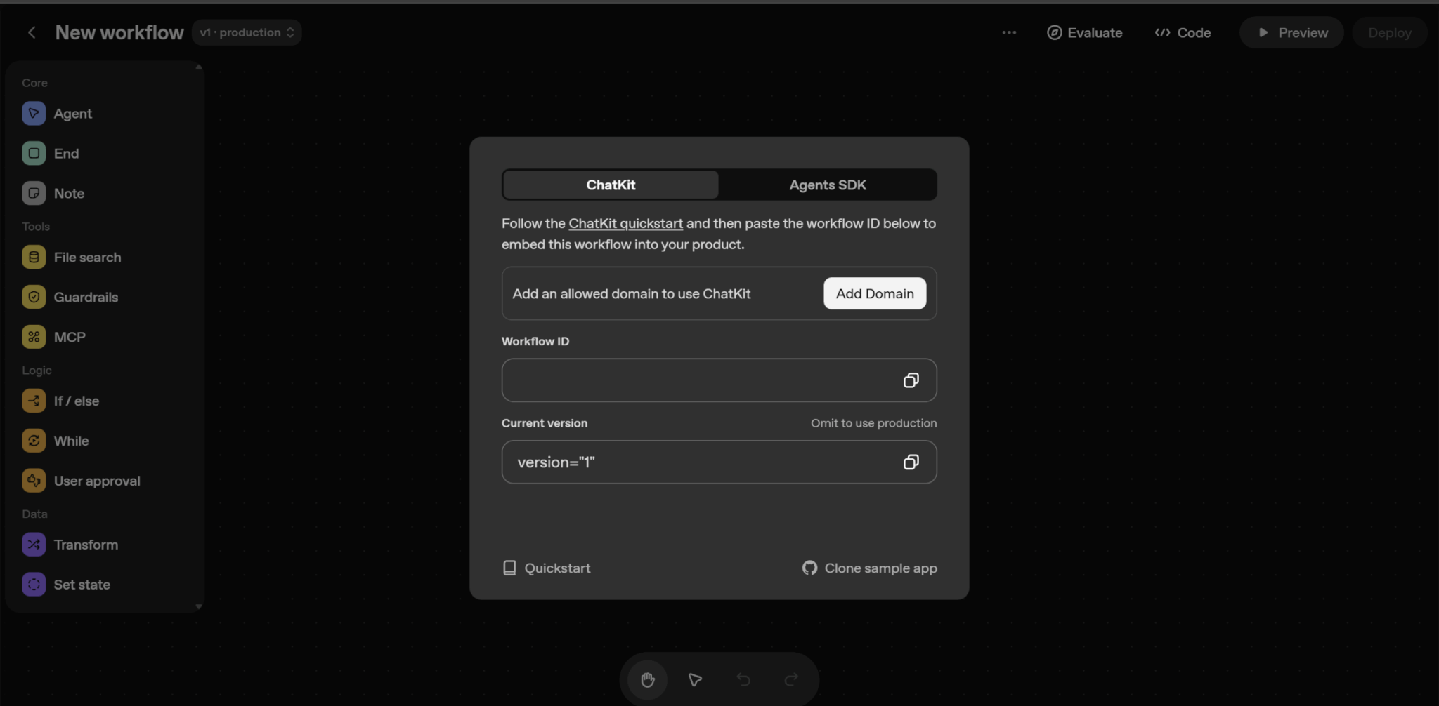 以上でワークフローが公開され、ChatKitやAgents SDKで利用するための情報が表示されます。