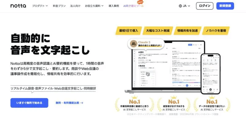 Nottaは、高精度なAI音声認識を活用した自動文字起こしサービスで、リアルタイム文字起こしや翻訳機能を提供し、自動で議事録を作成することができます。
