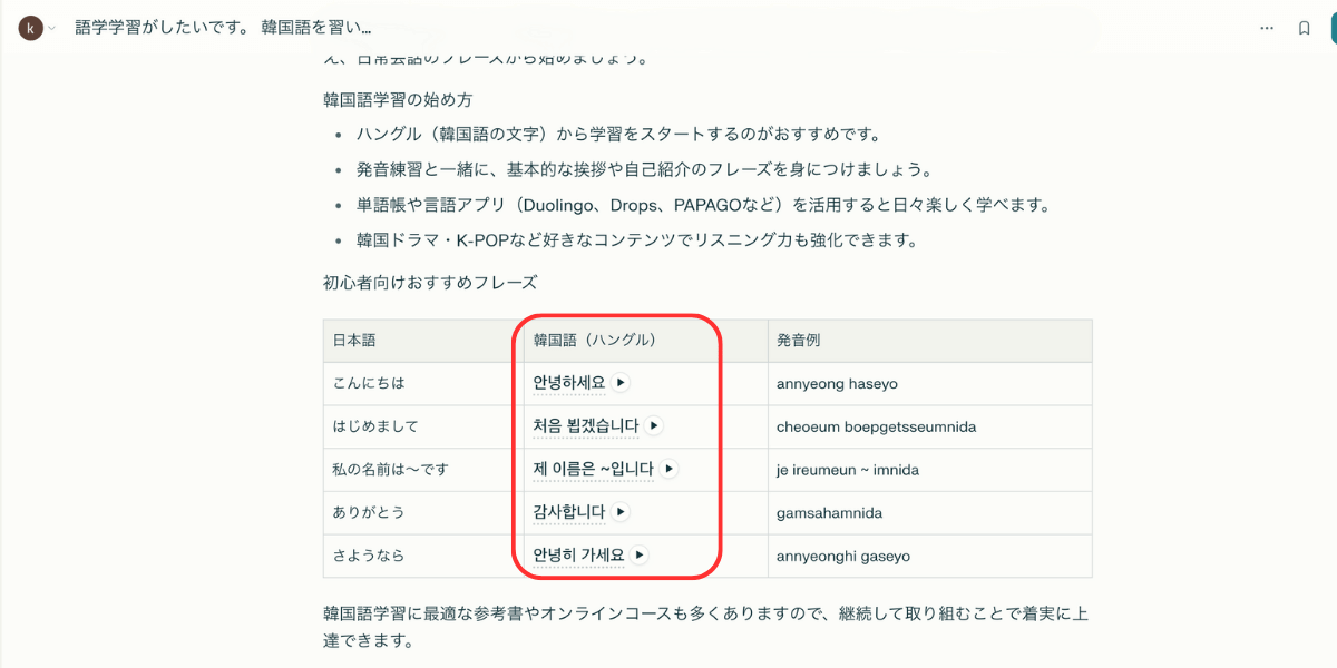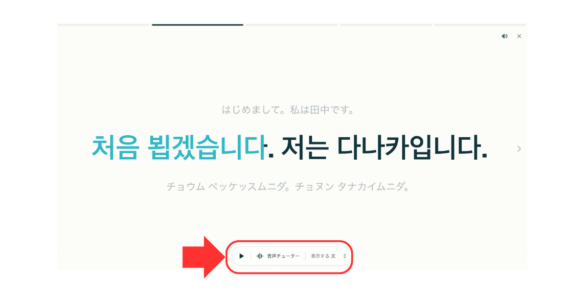 赤枠内の音声チューターをクリックすると、マイクを使用して、AIと会話をしながら言語学習ができます。