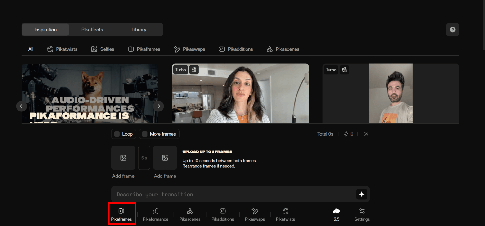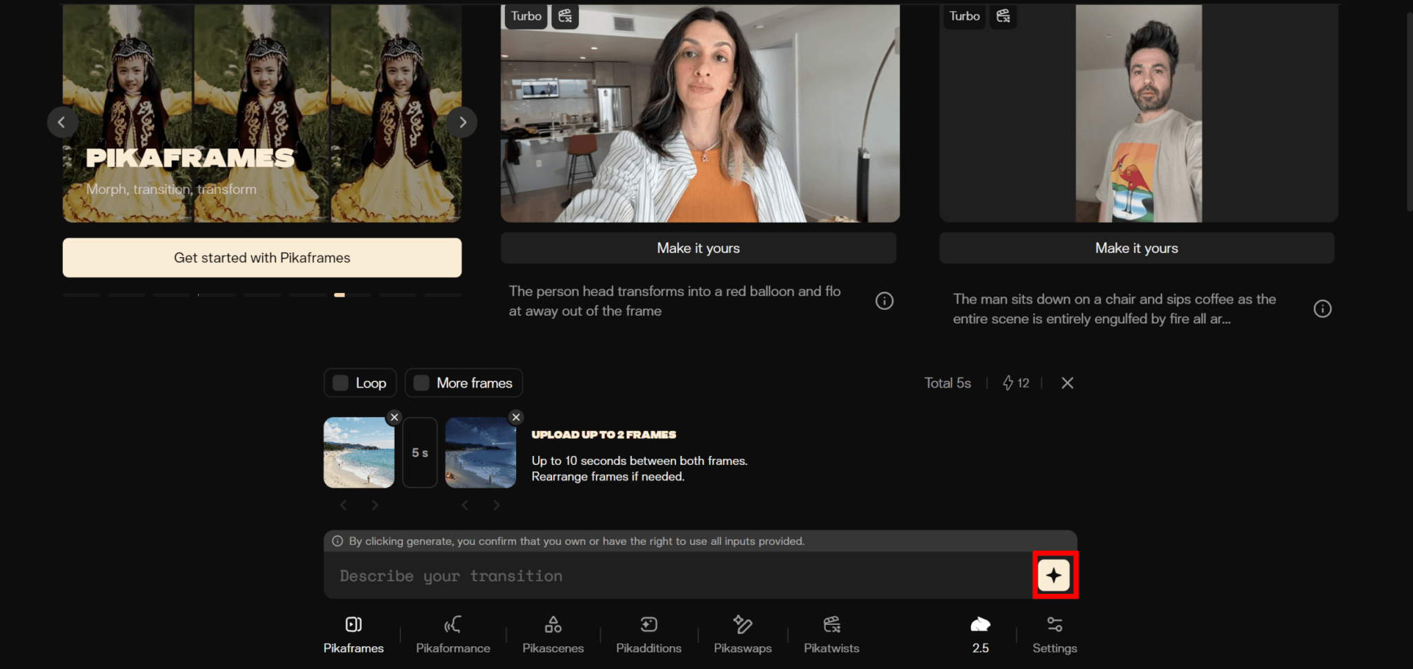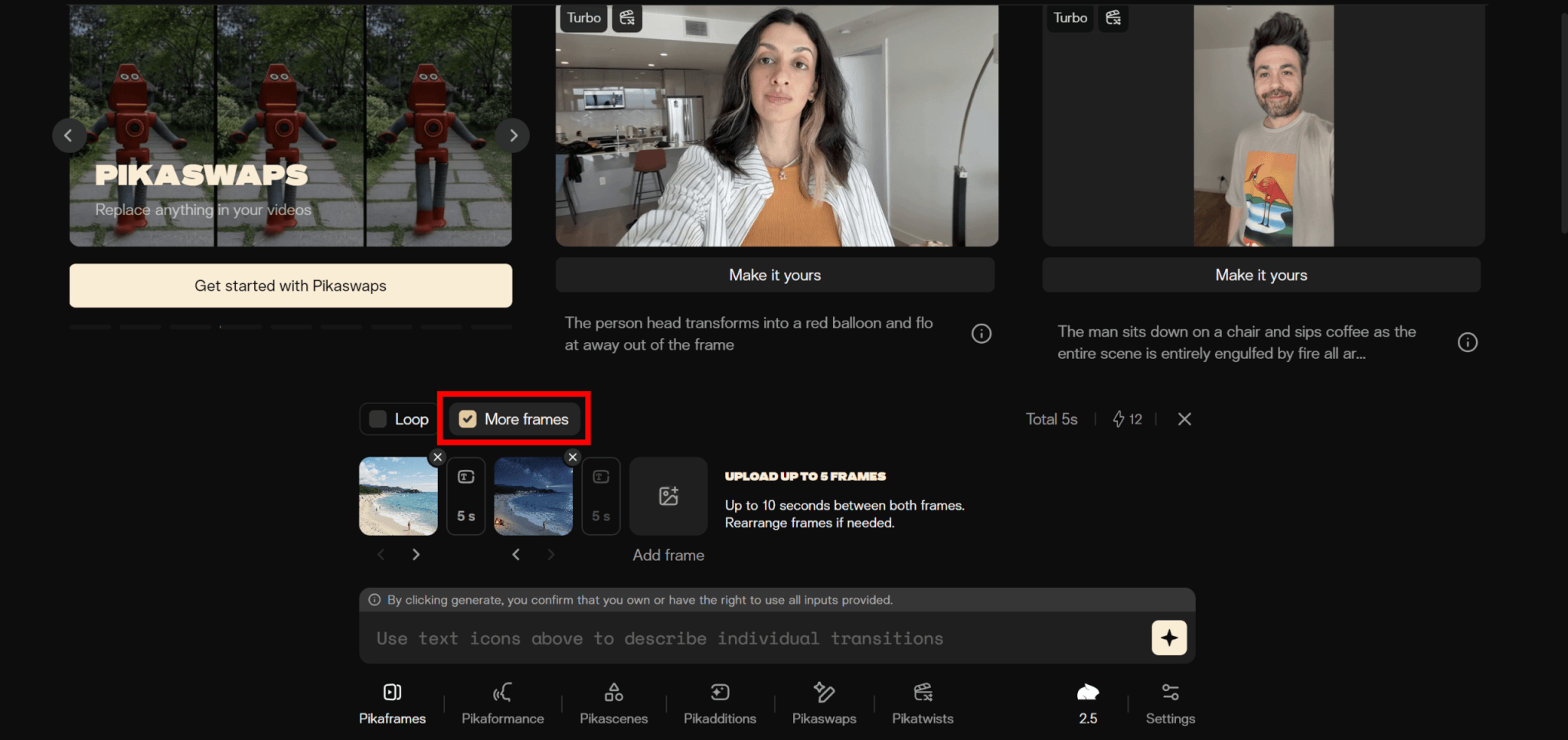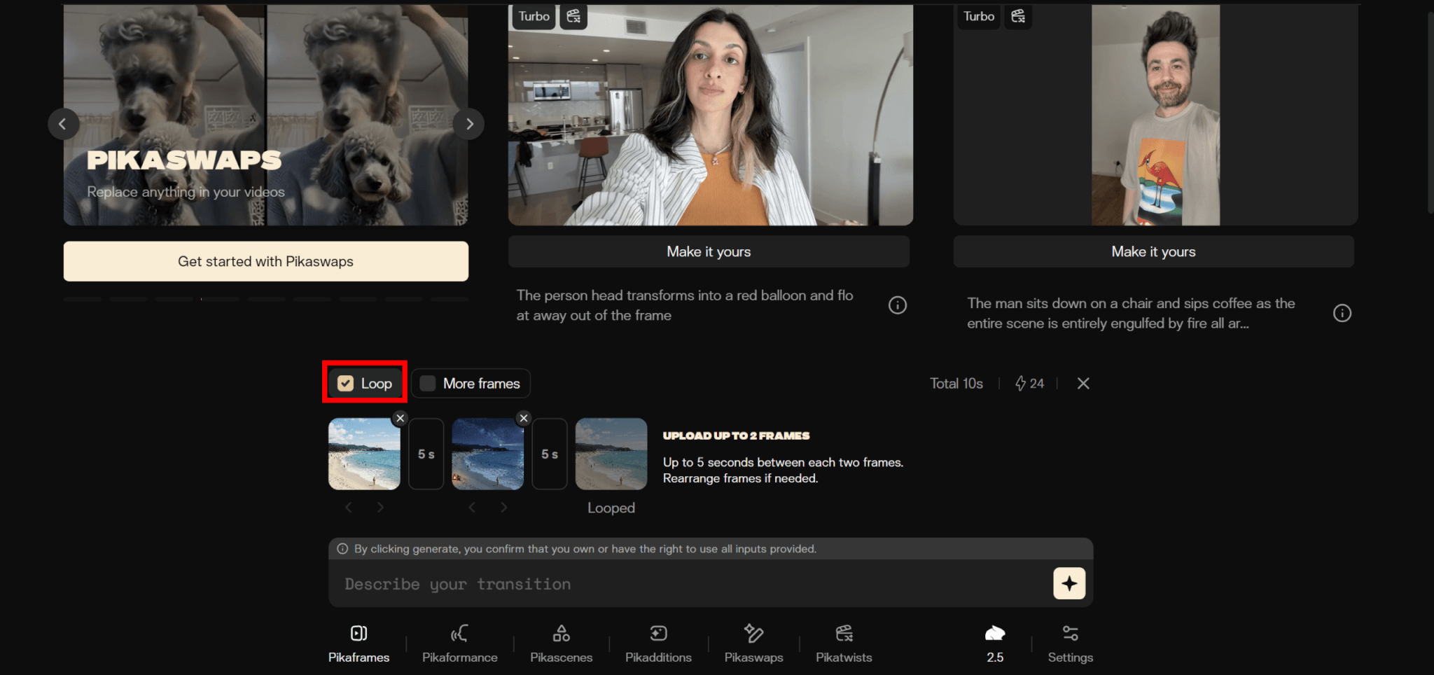 Pikaframesでは2枚以上の画像を使ってトランジション動画を作成できます。
