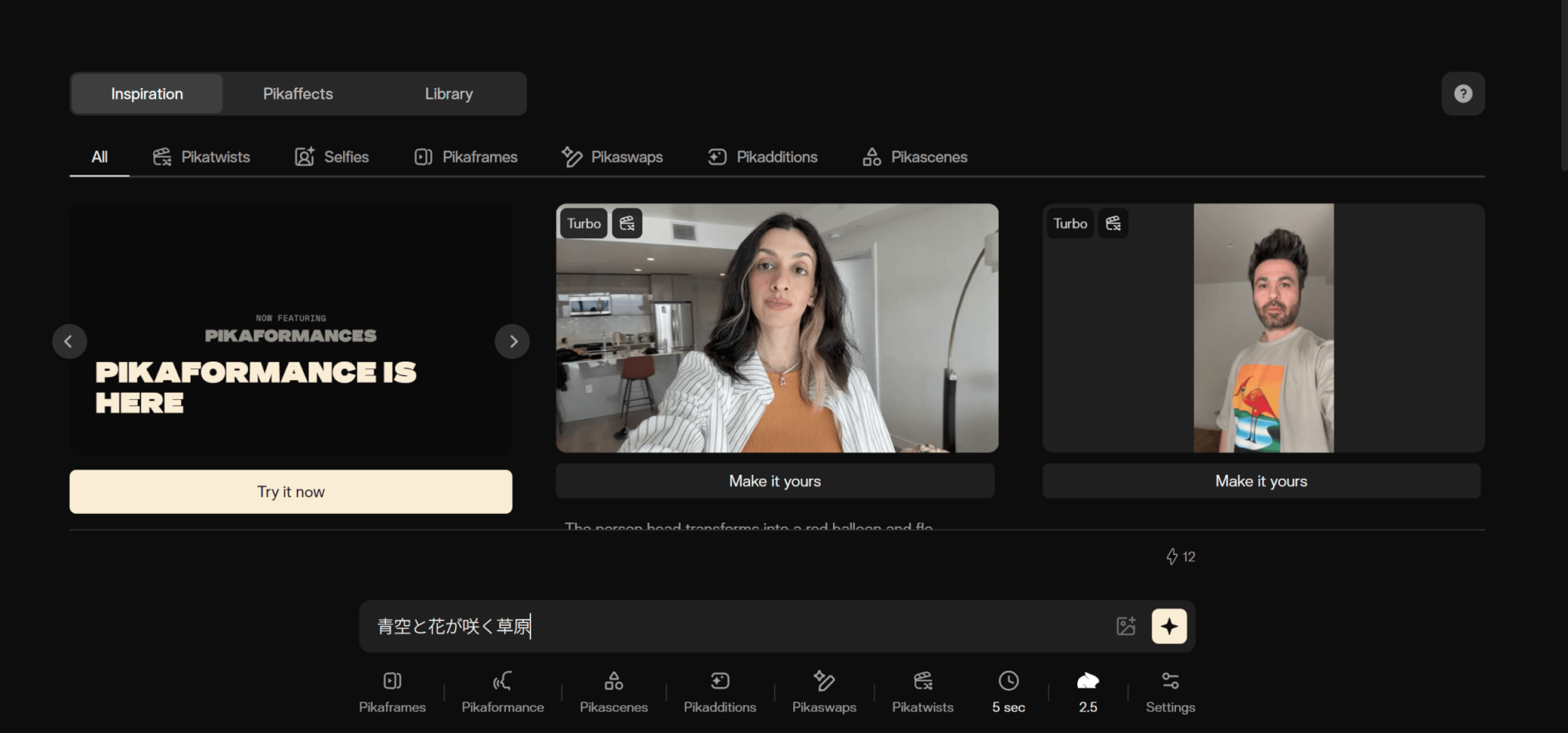 Pikaの最も基本となる機能が、テキスト・画像を入力として短尺動画を生成する2つのモードです。